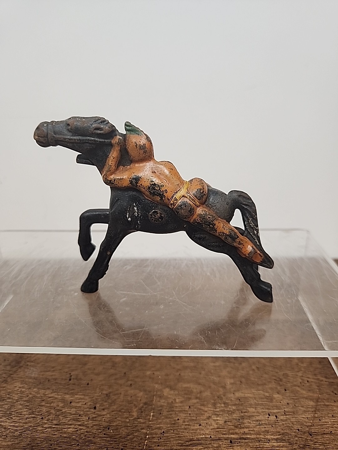 ANTIQUE GREY IRON NATIVE AMERICAN MOUNTED ON HORSE WITH RIFLE