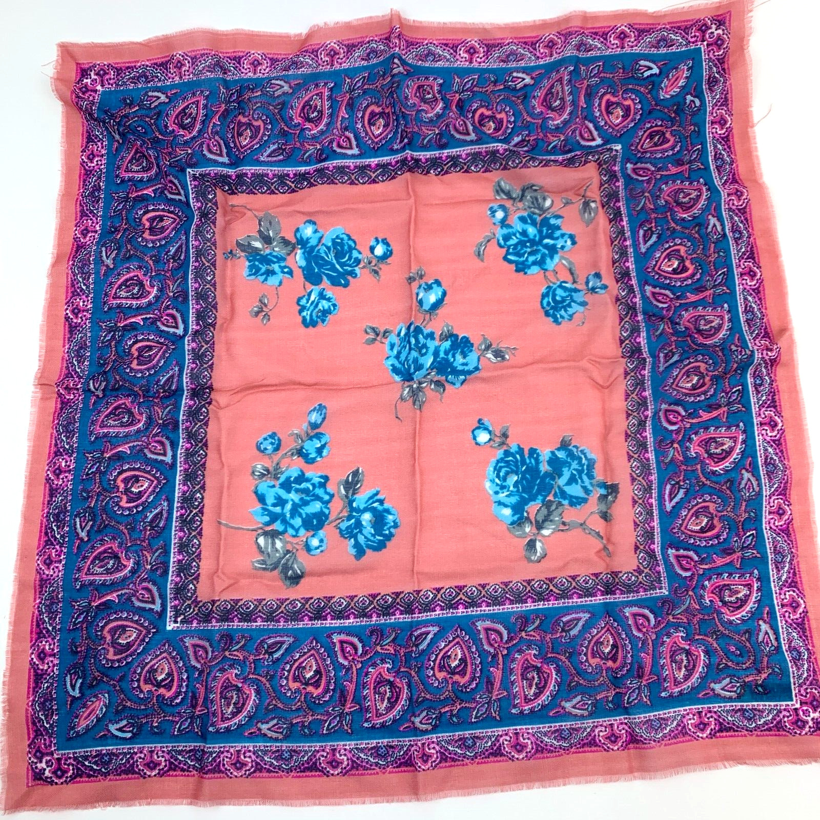 как выглядит Vintage Made in Japan Fringed Floral Pink Blue Roses Acrylic Scarf 25 x 25 фото