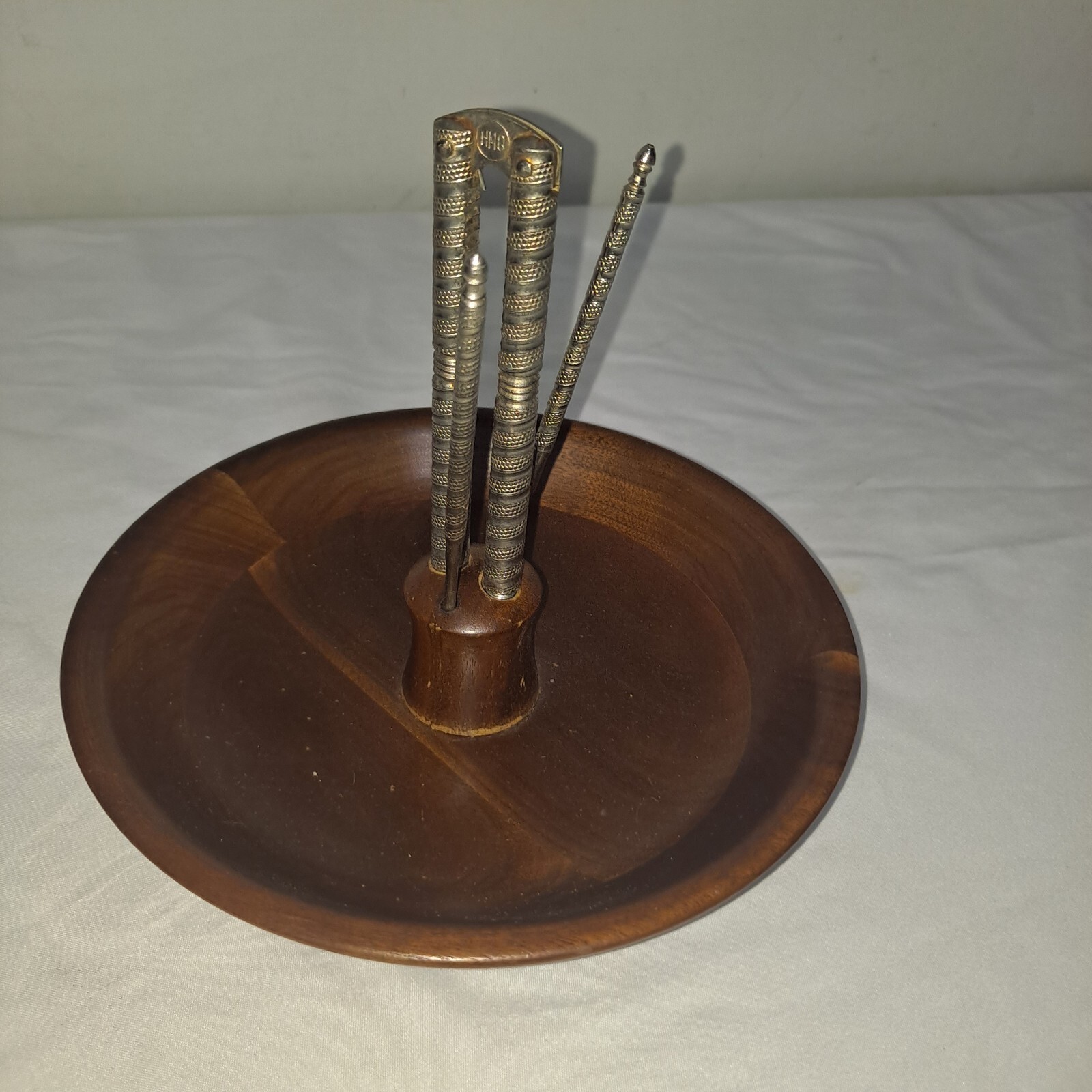 Vermillion Solid Walnut Nut Bowl W/ Cracker and Picks MCM