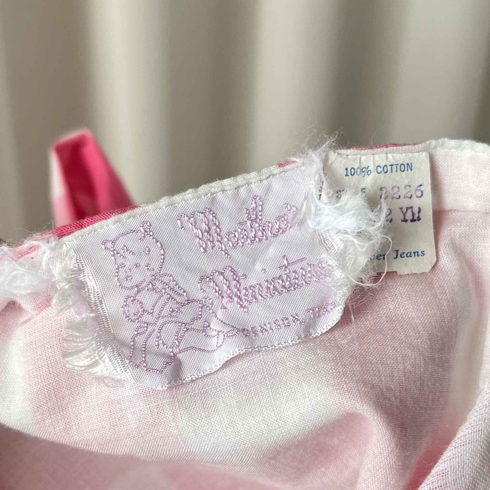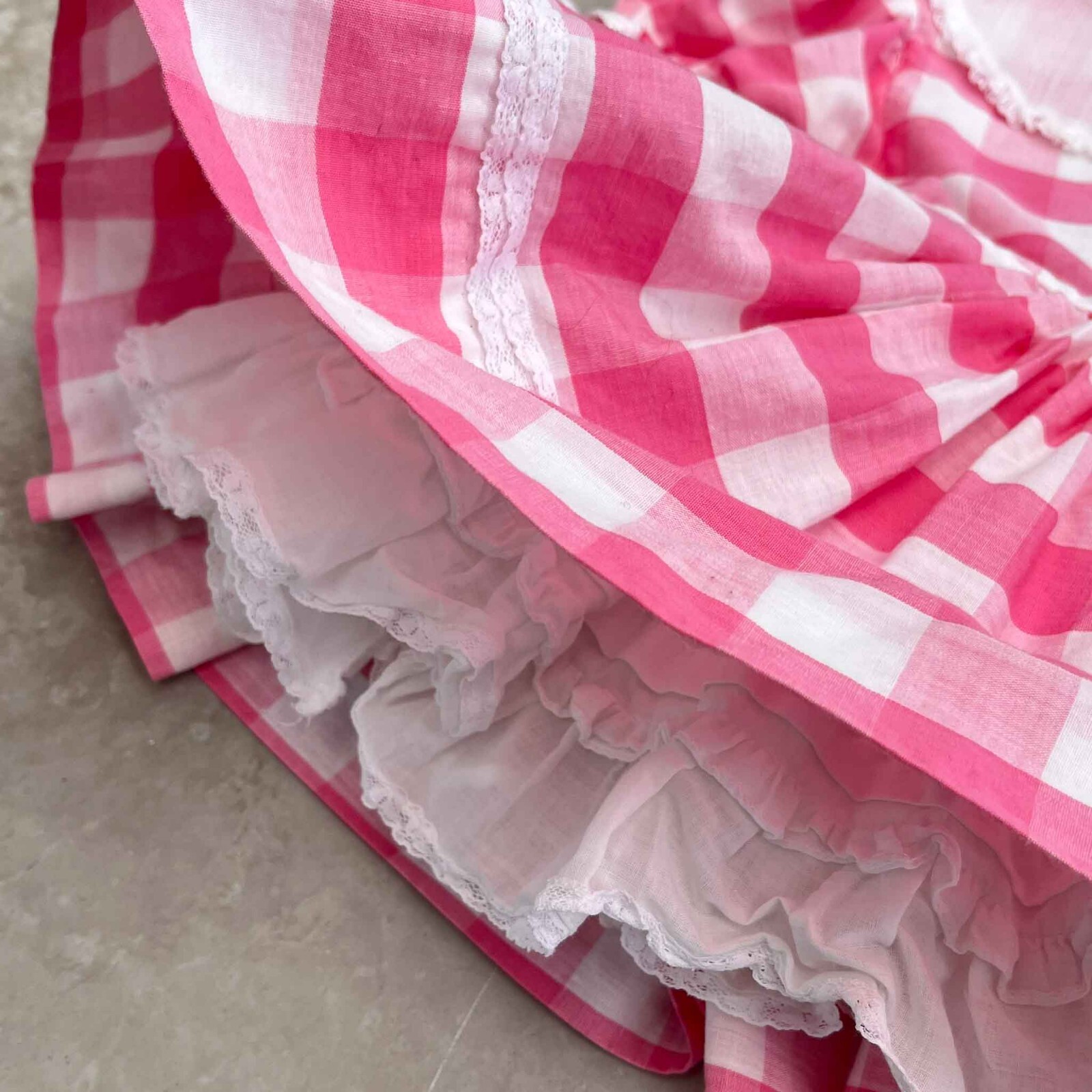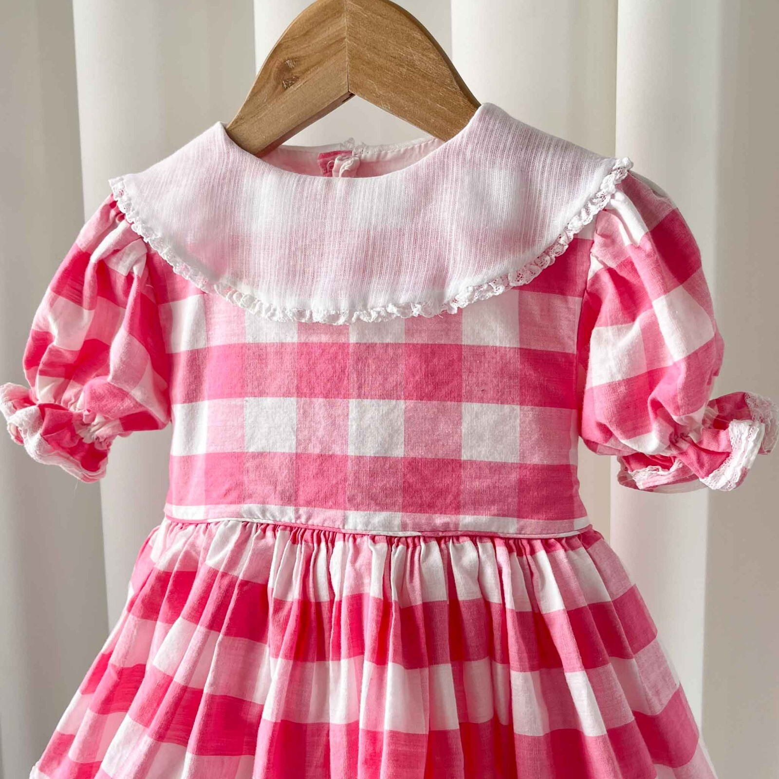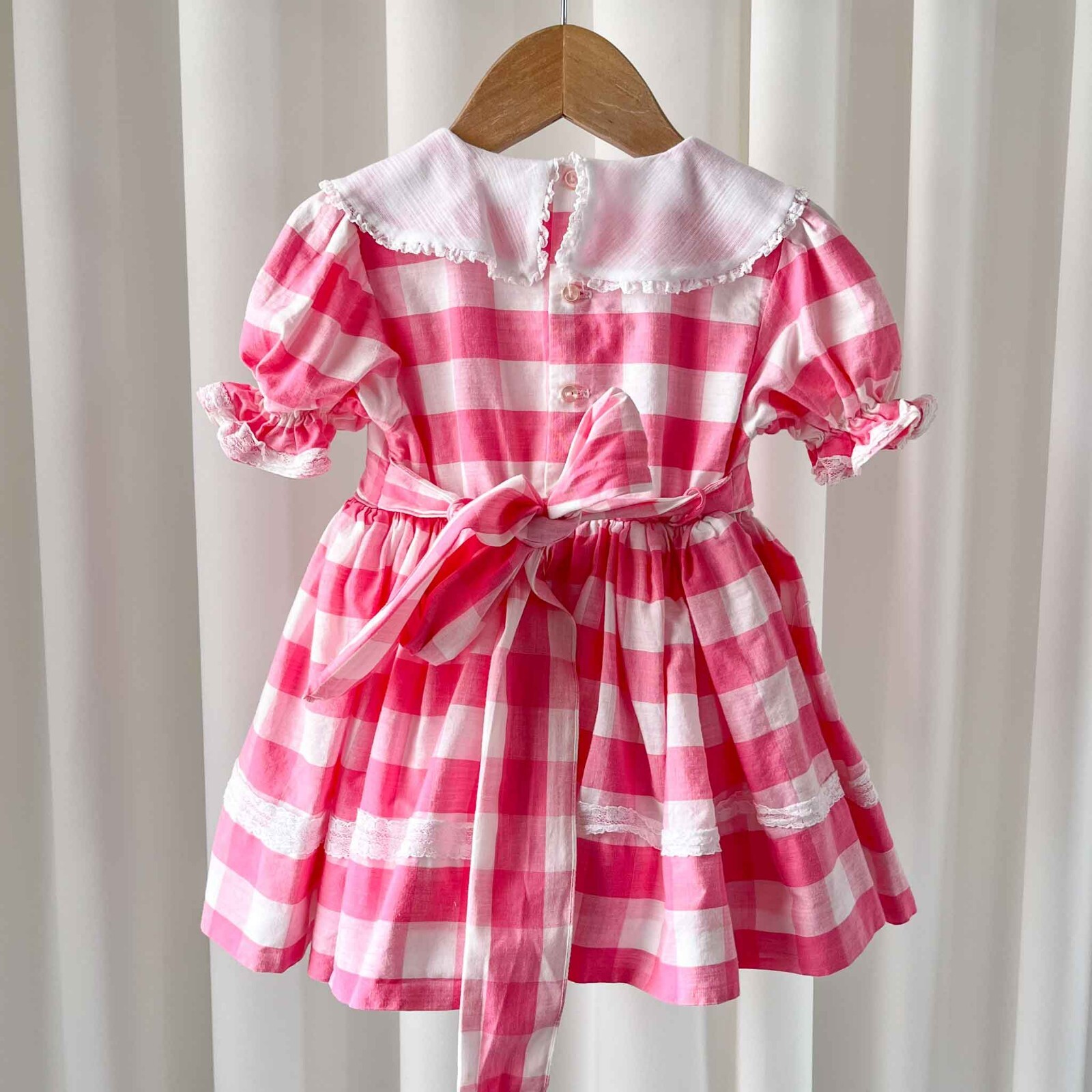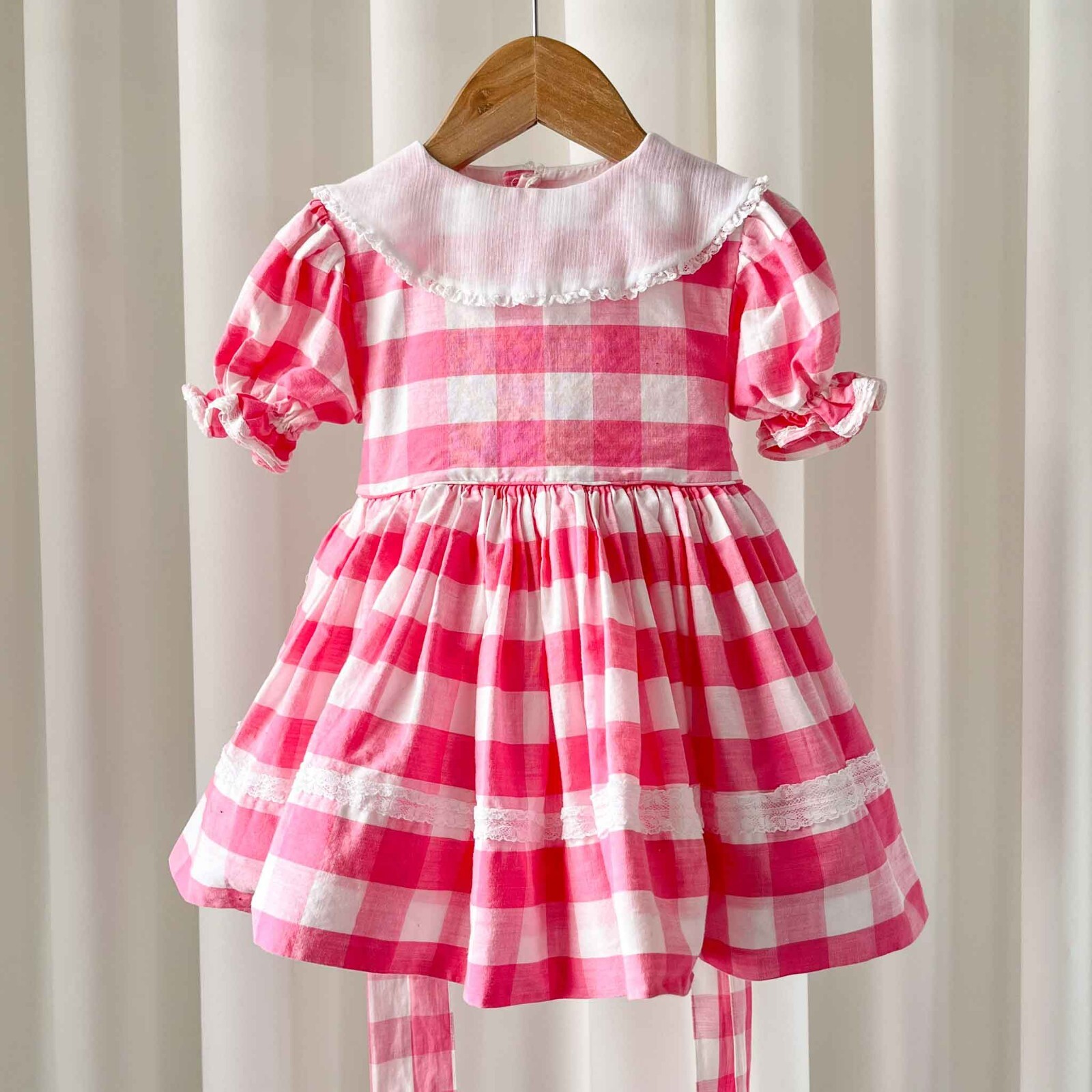 Vintage 80s Martha's Miniatures Pink White Gingham Lace Trim Baby Girls Dress 2T