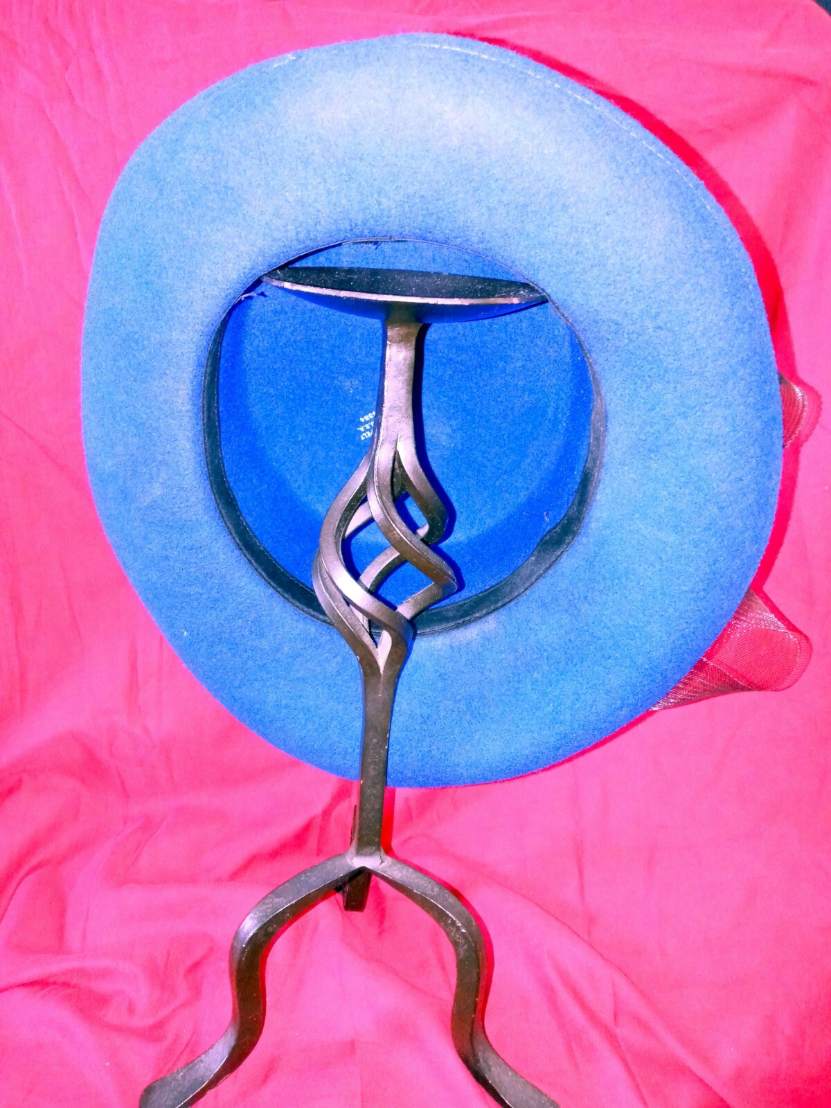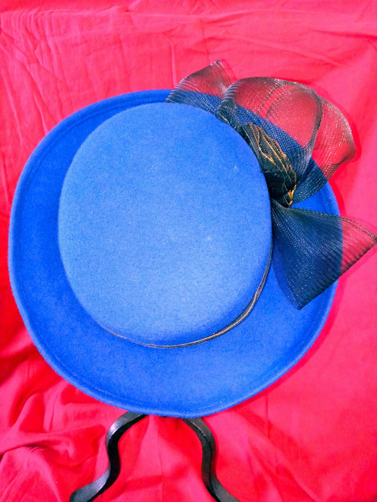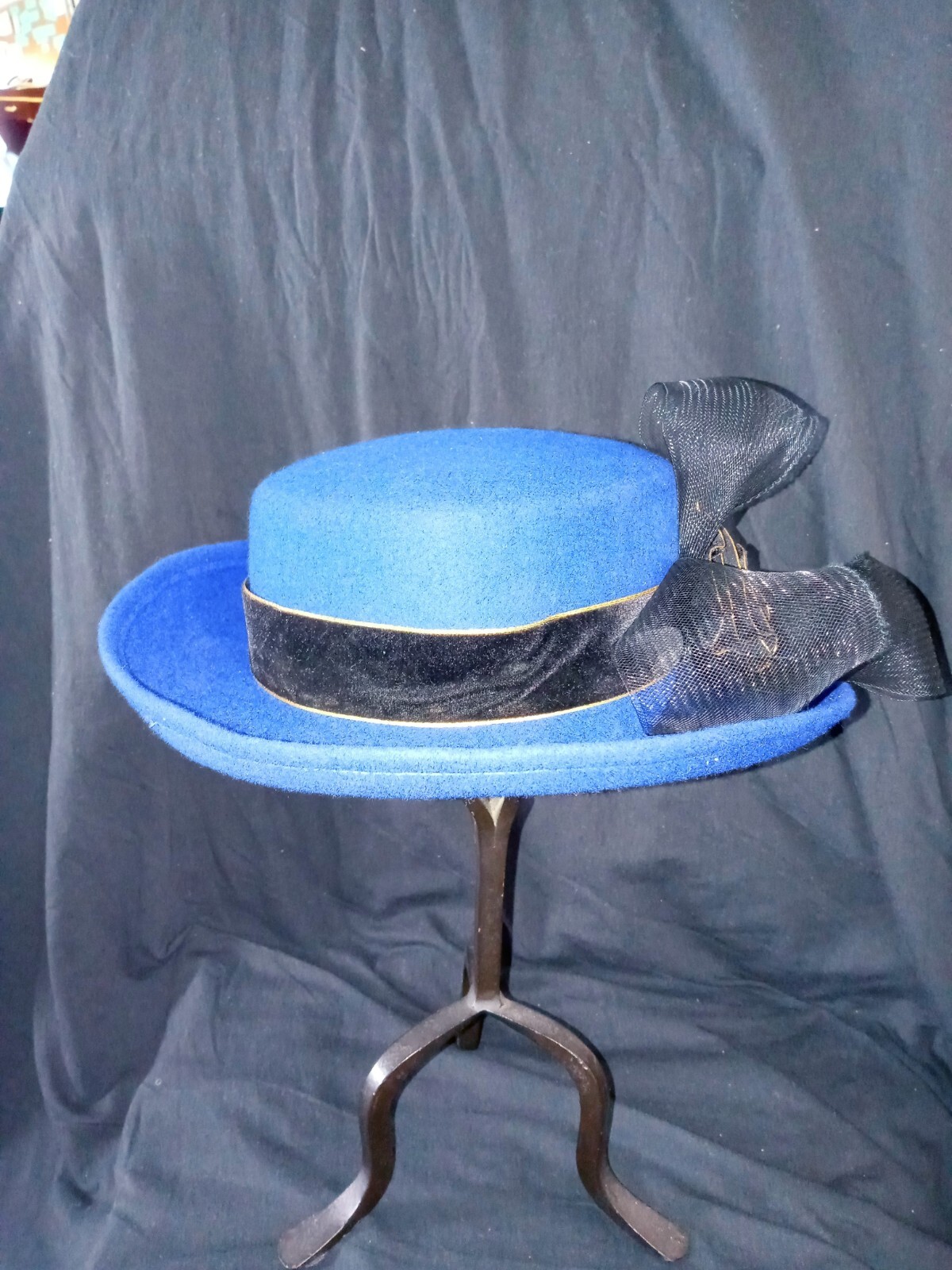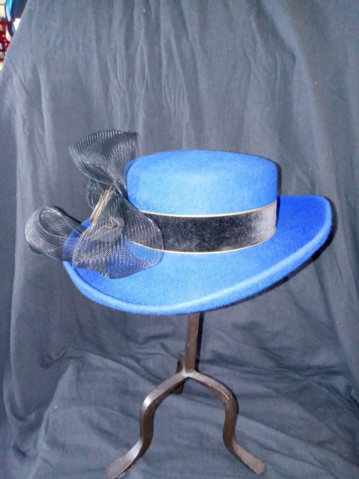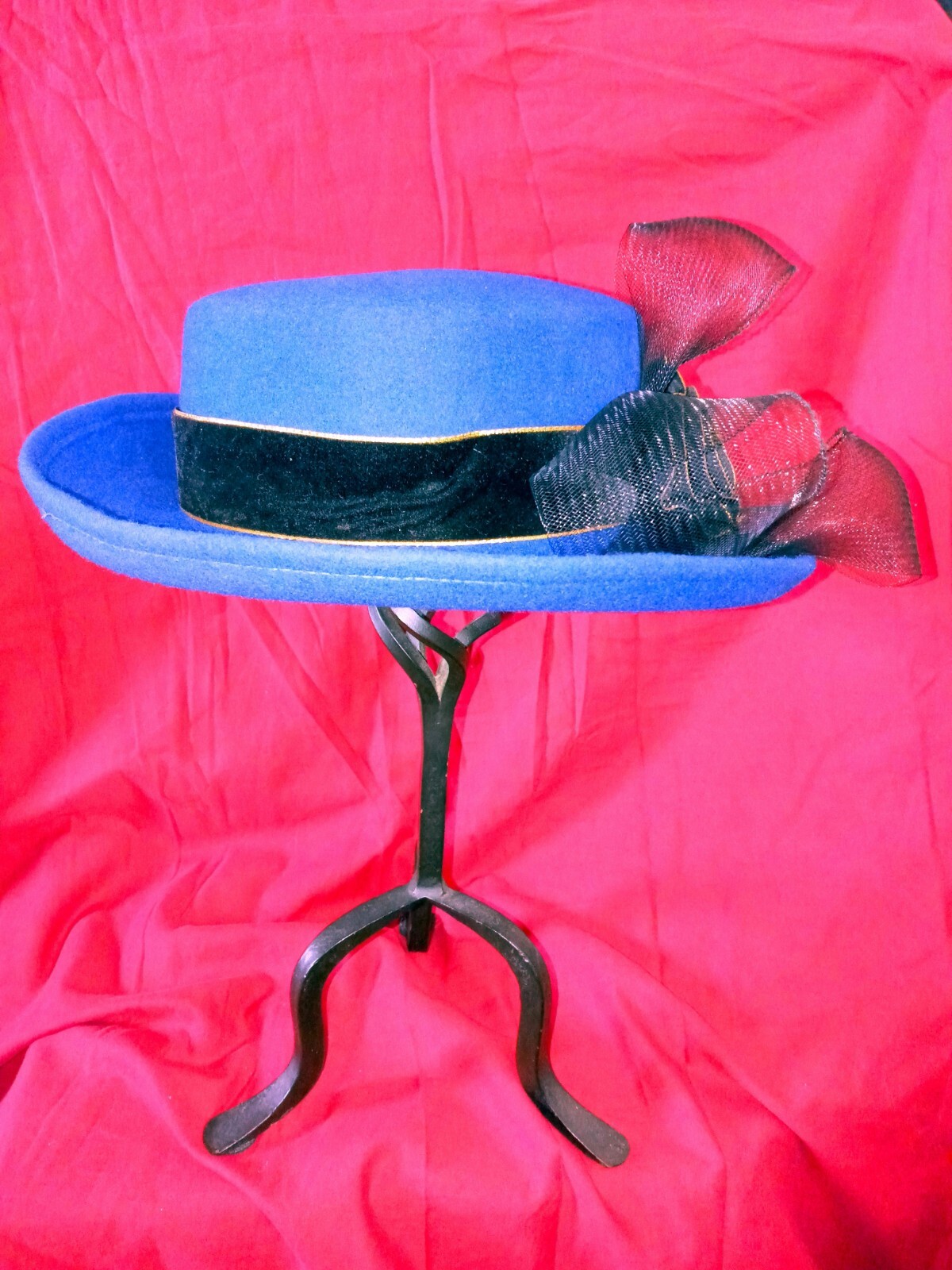 как выглядит vtg Royal Blue/Black Bowler Hat Church Casual Ribbon Flower Bow Brim12" Head6.5" фото