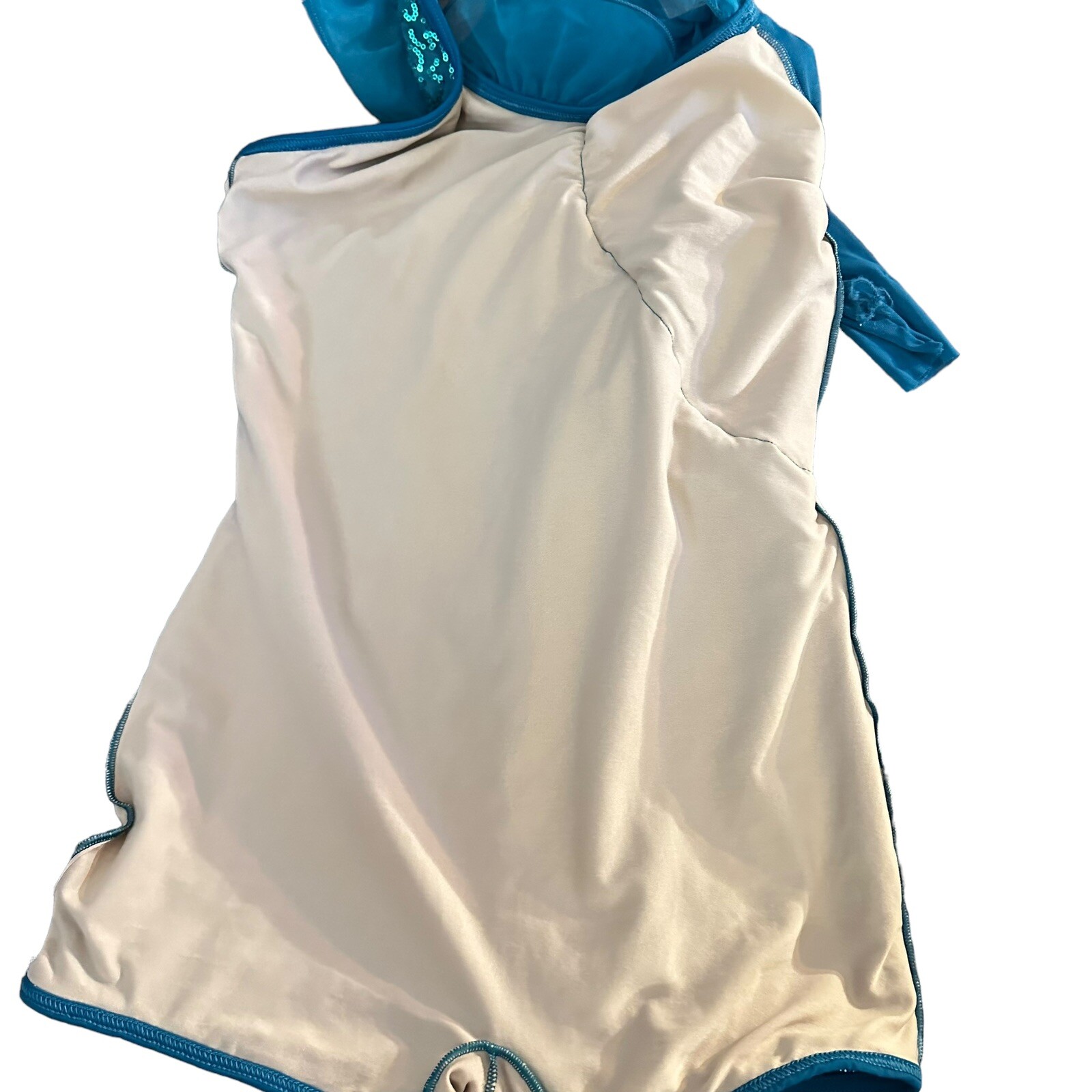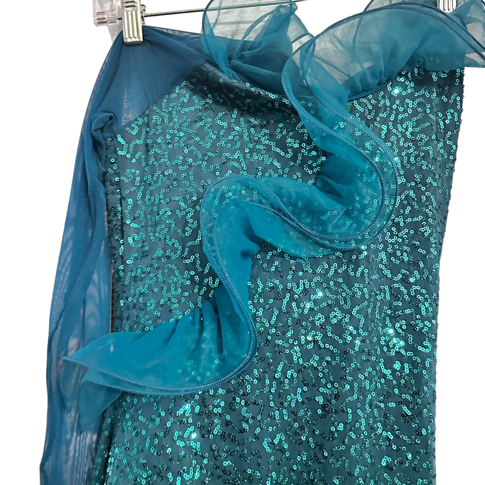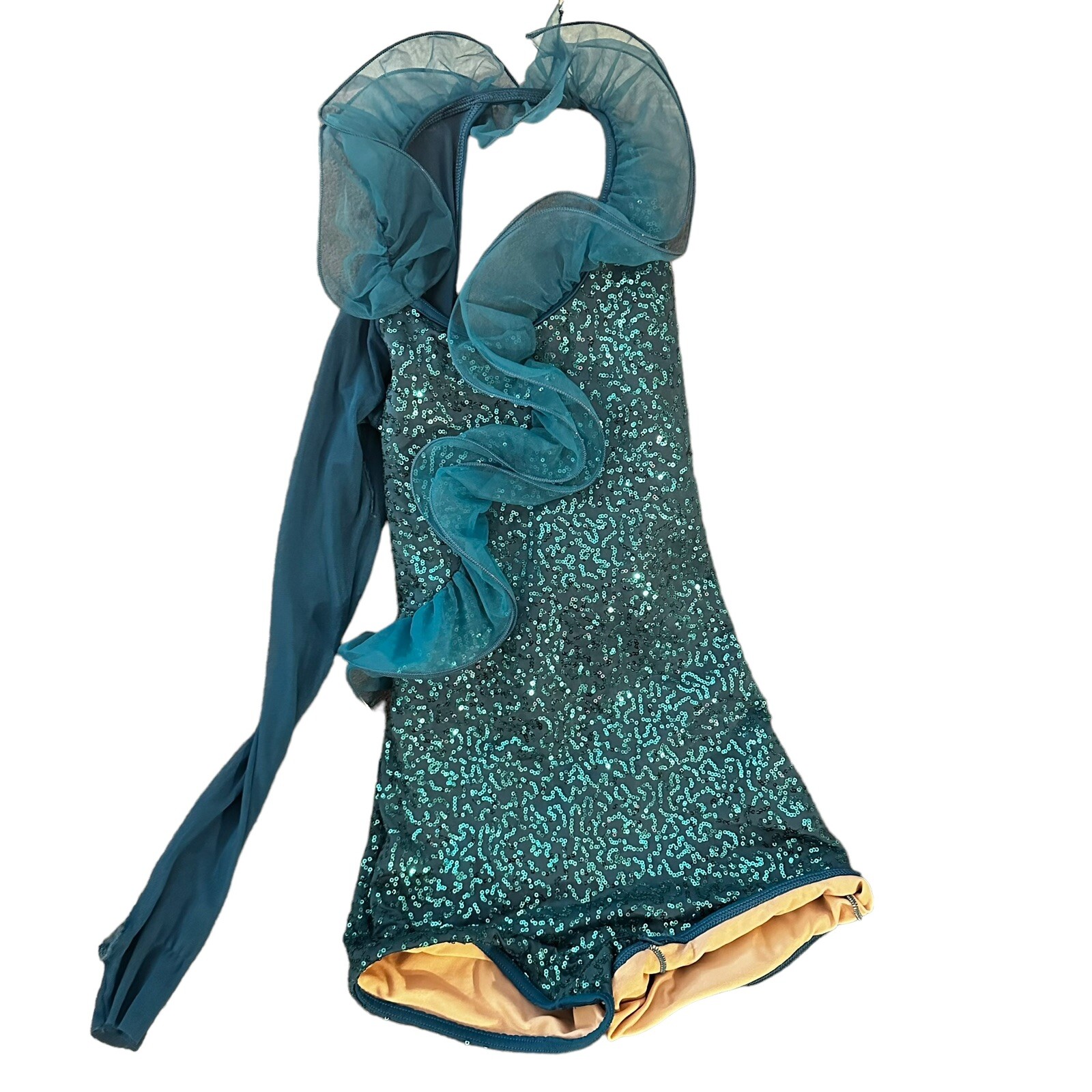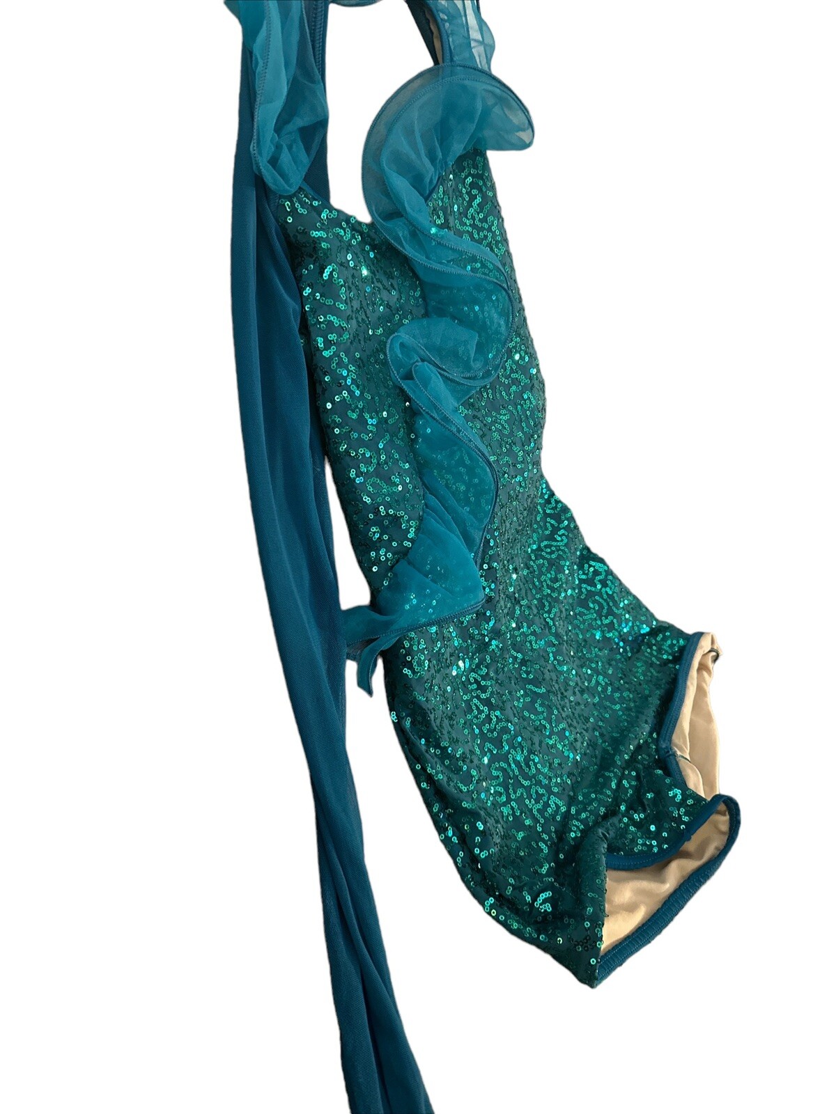 Weissman Dance Costume Jazz Teal Sequence, One Sleeve,Large Ruffle, Girls sz L