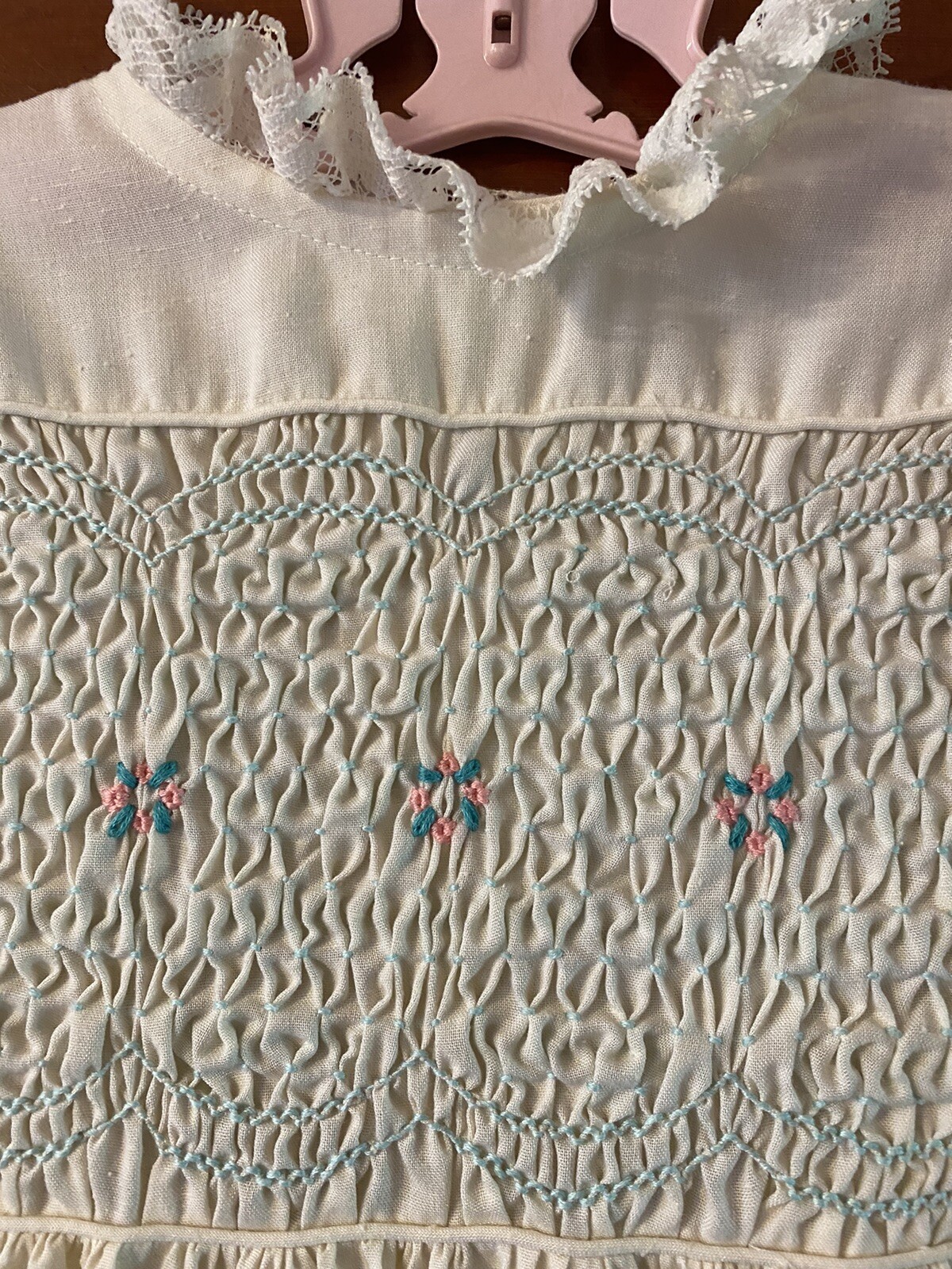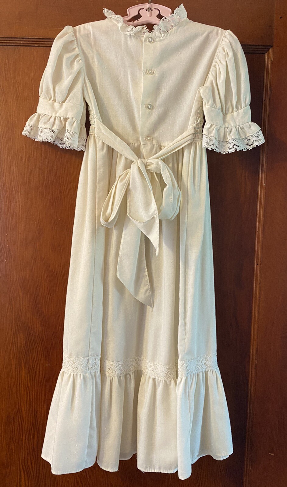 как выглядит Vtg Polly Flinders Beige Ivory Long Short Sleeve Ruffle Dress 6 Hand Smocked фото