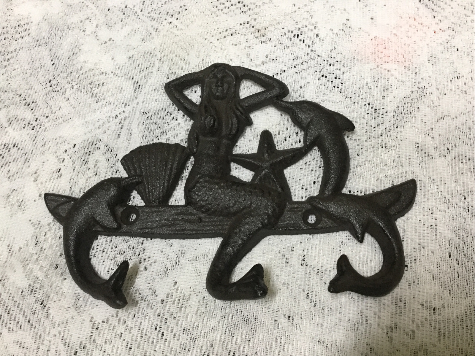 Cast Iron 3 Hook Wall Hanger Mermaid With Dolphins 184-0807