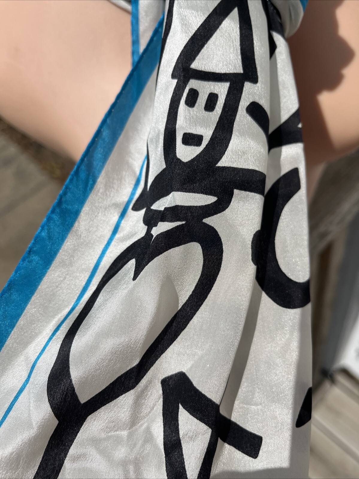 Vintage Albert Nipon Abstract Pop Art Silk Scarf Rectangle Black White Teal