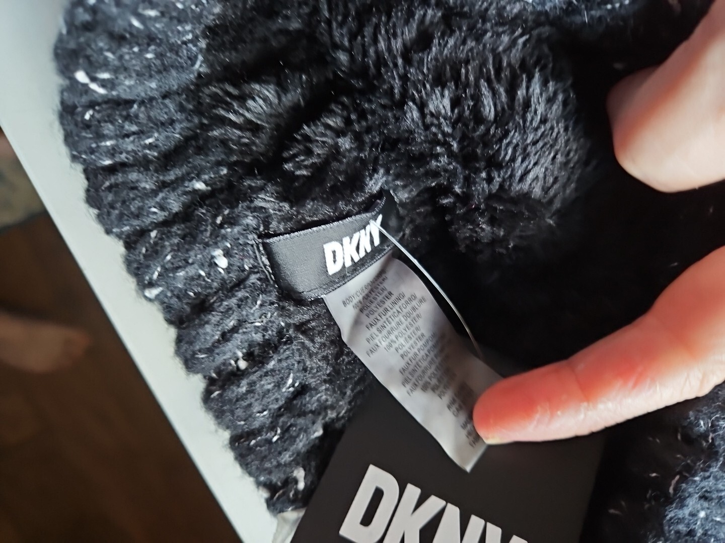 как выглядит New DKNY Pom Pom Hat Beanie Black Knit Fleece Lined Ribbed Women