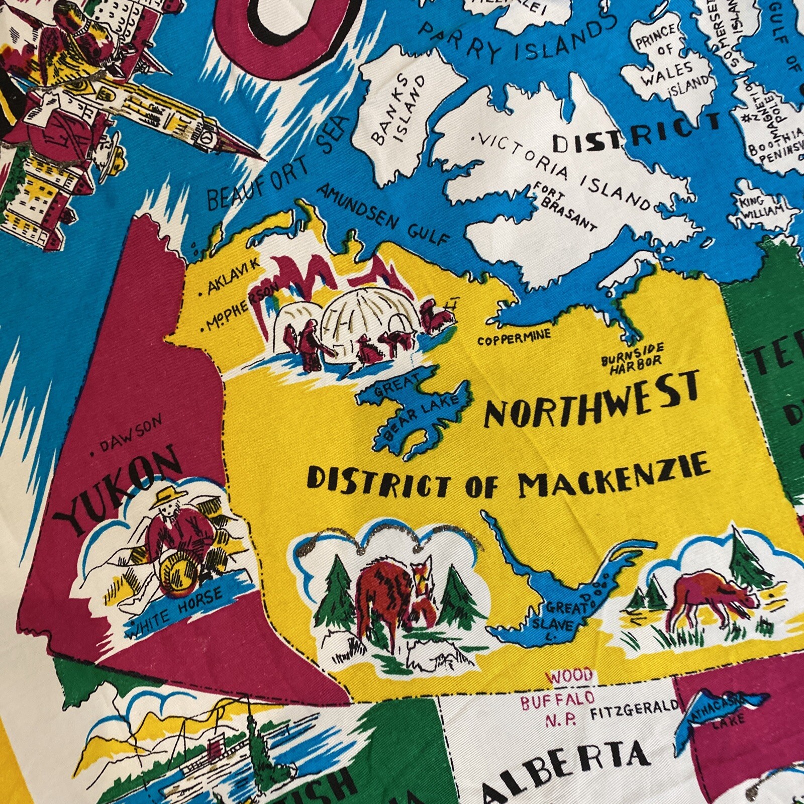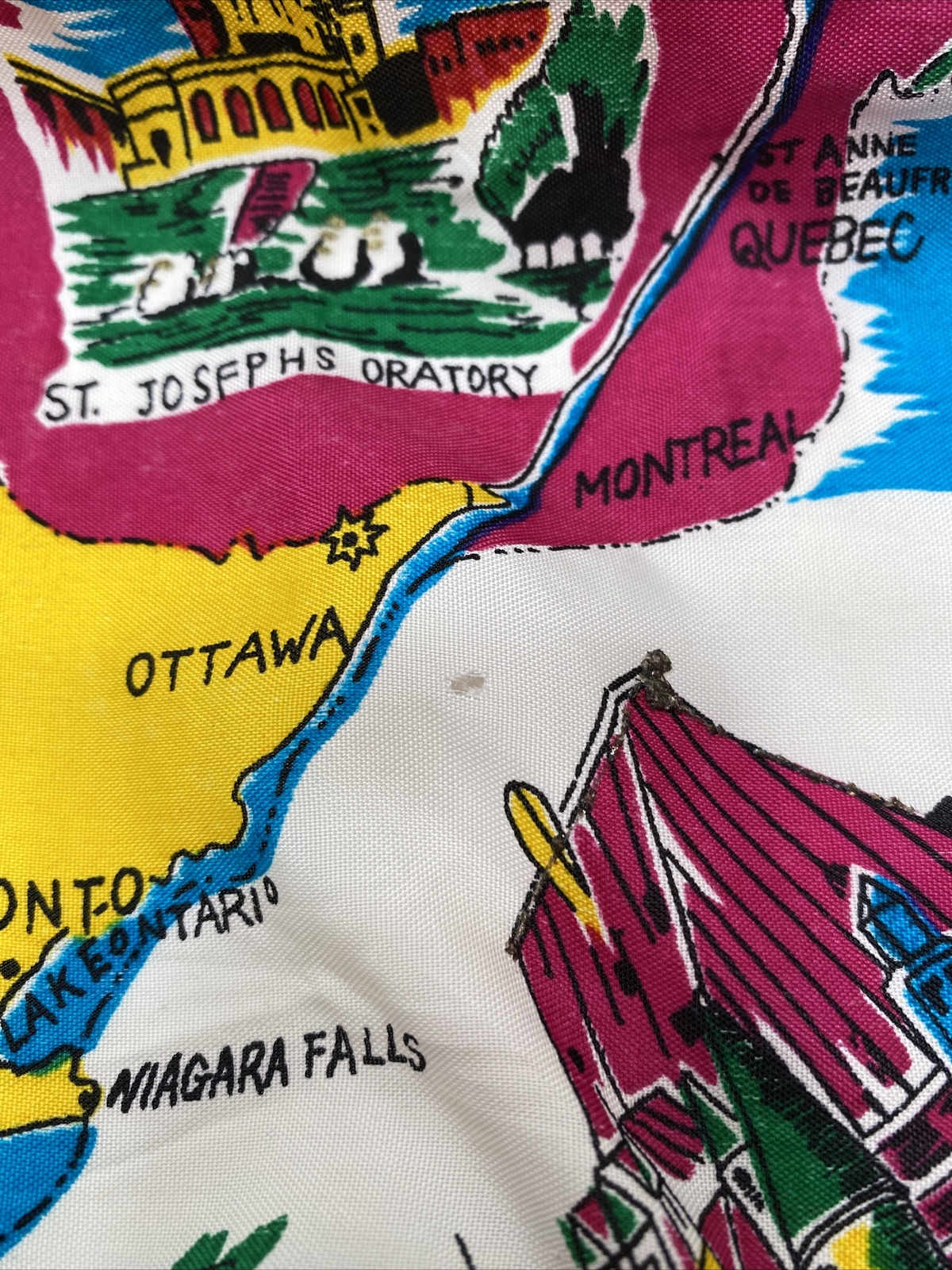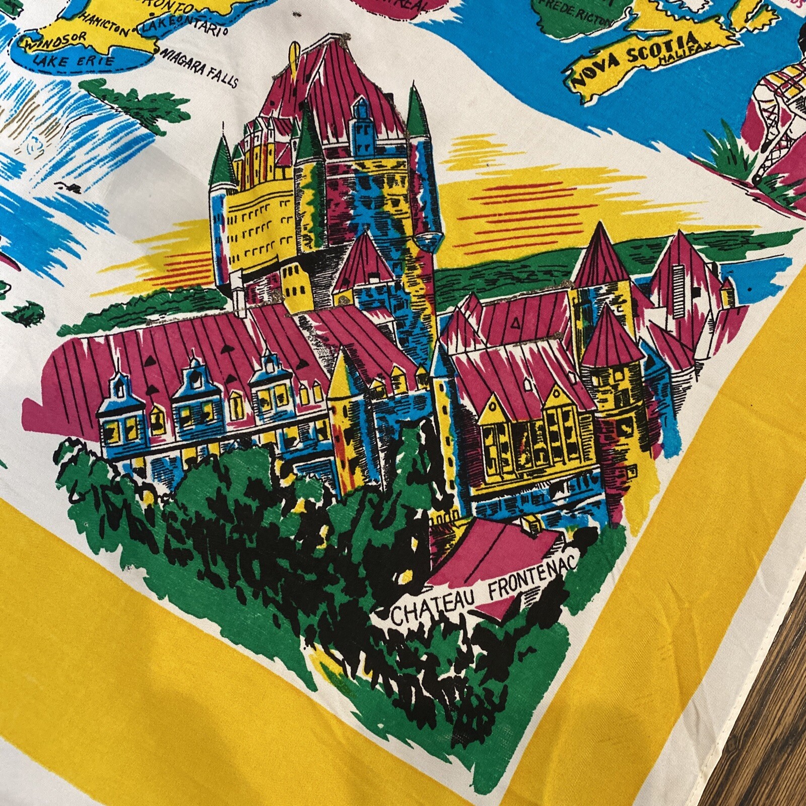 Vintage Colorful DOMINION OF CANADA Silk Blend Scarf w/ Canadian Landmarks 30x36
