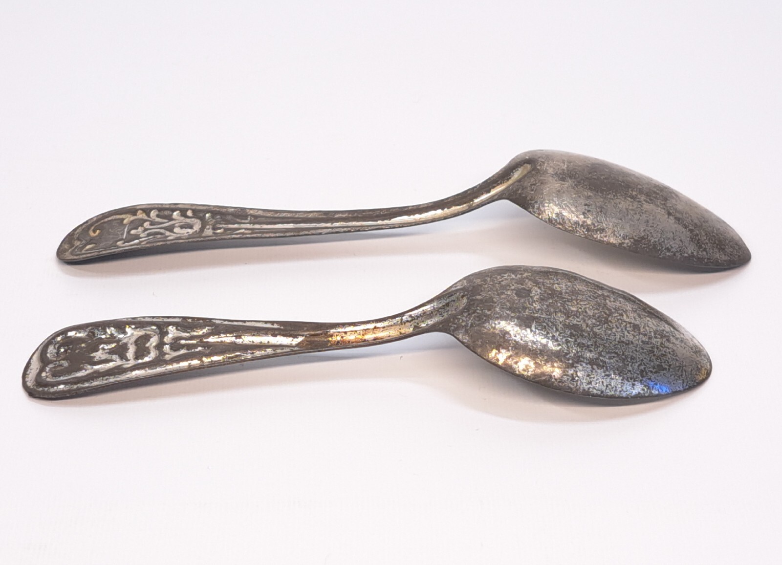 ANTIQUE SET OF 2 TINWARE CHILD'S PRETEND PLAY / DOLL HOUSE FLATWARE SPOONS