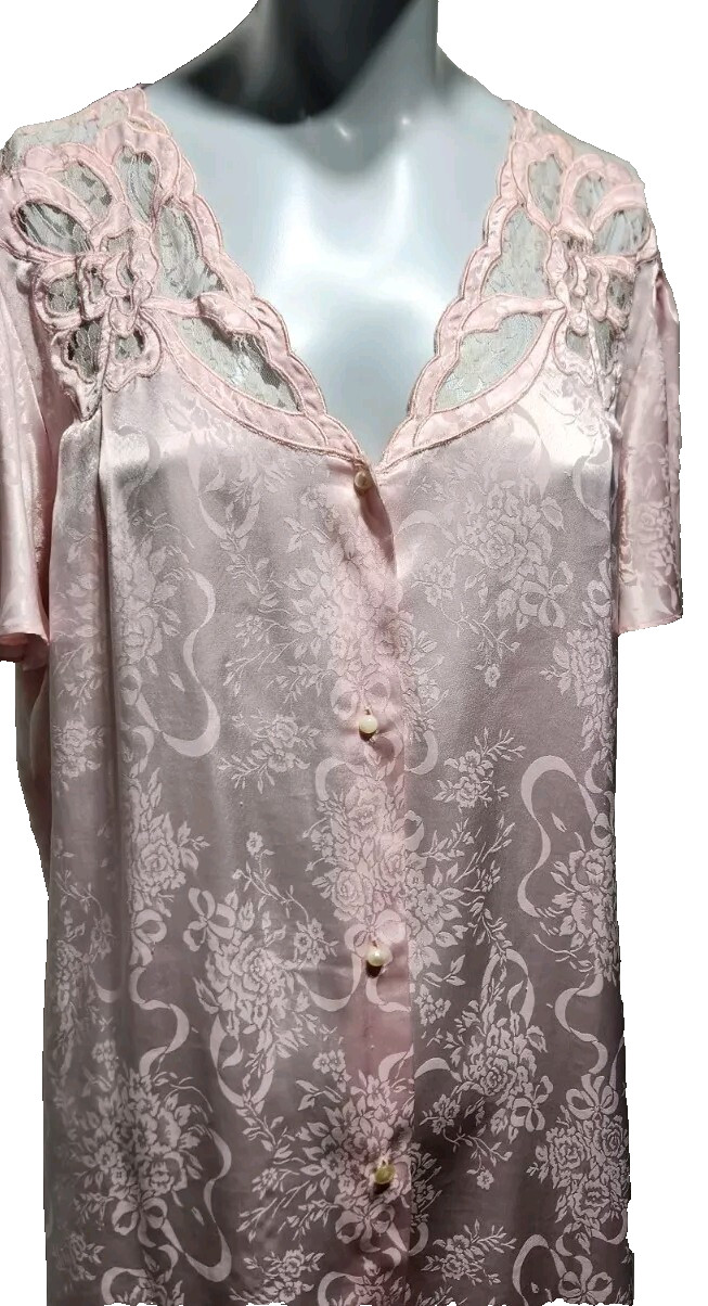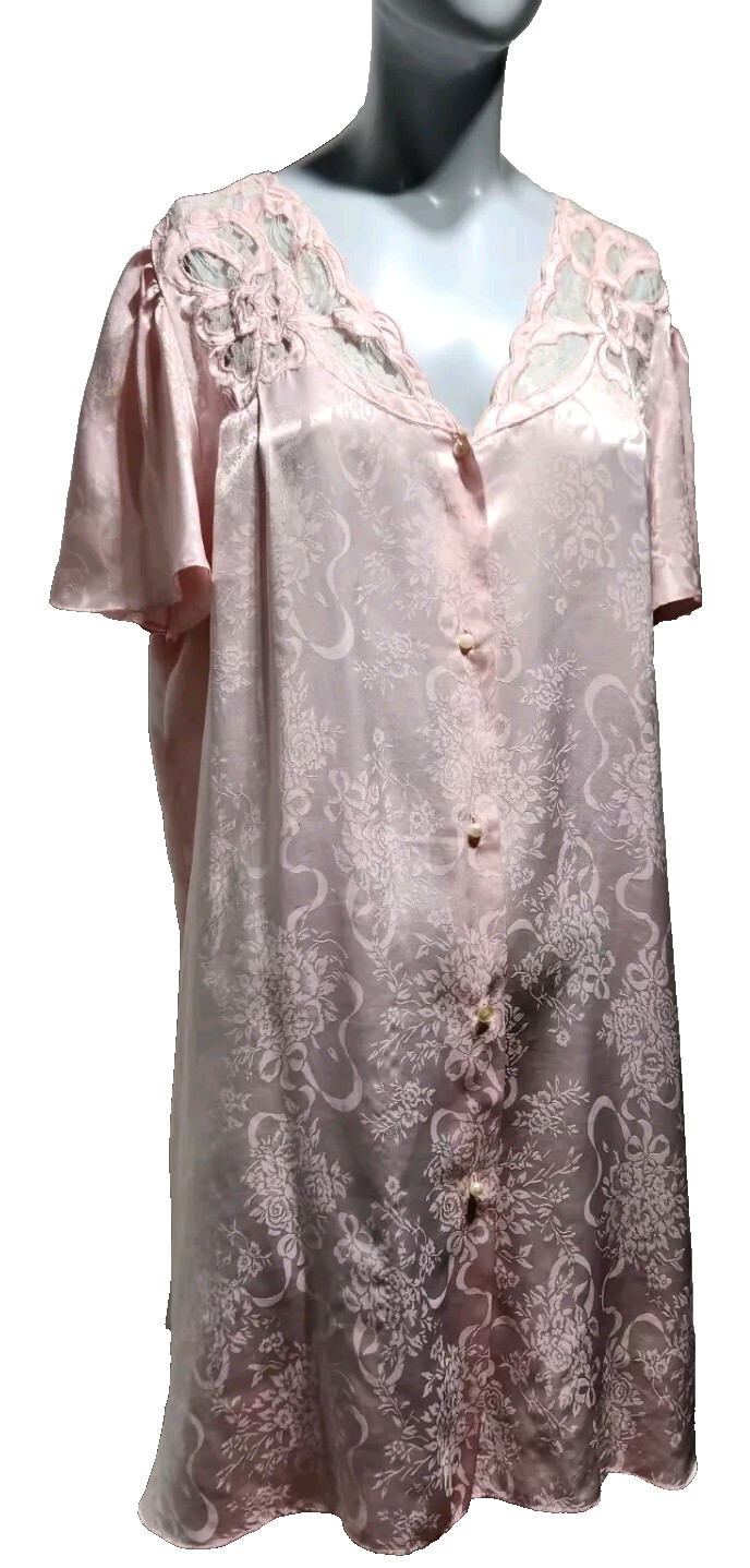 Vintage Nightgown Erika Taylor Pink Satin Silky Lace Trim Modest Style Sz Large