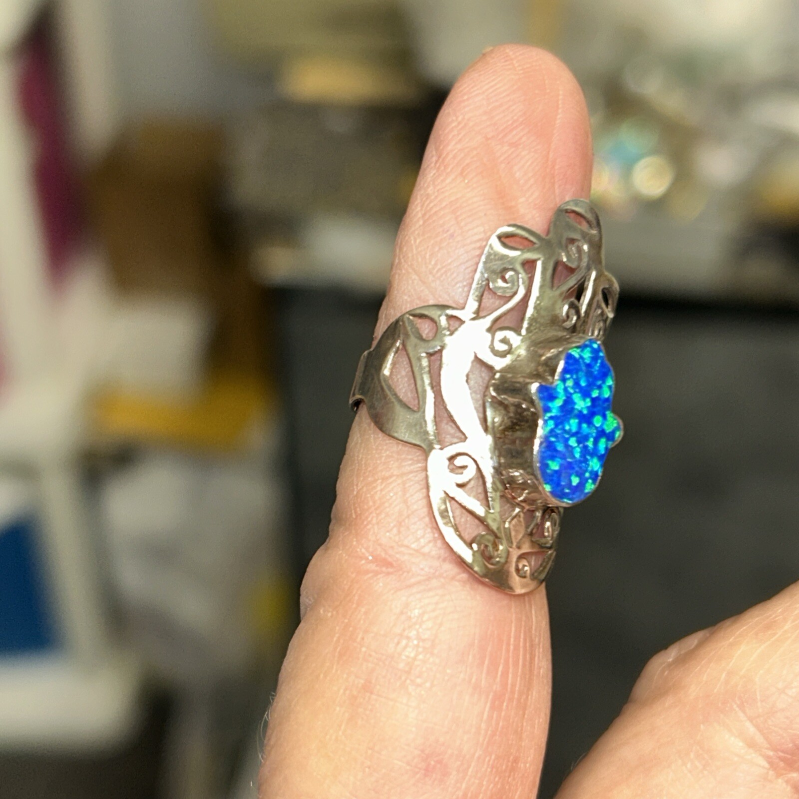 925 Sterling Australian Opal Hamsa Hand Ring Size 5