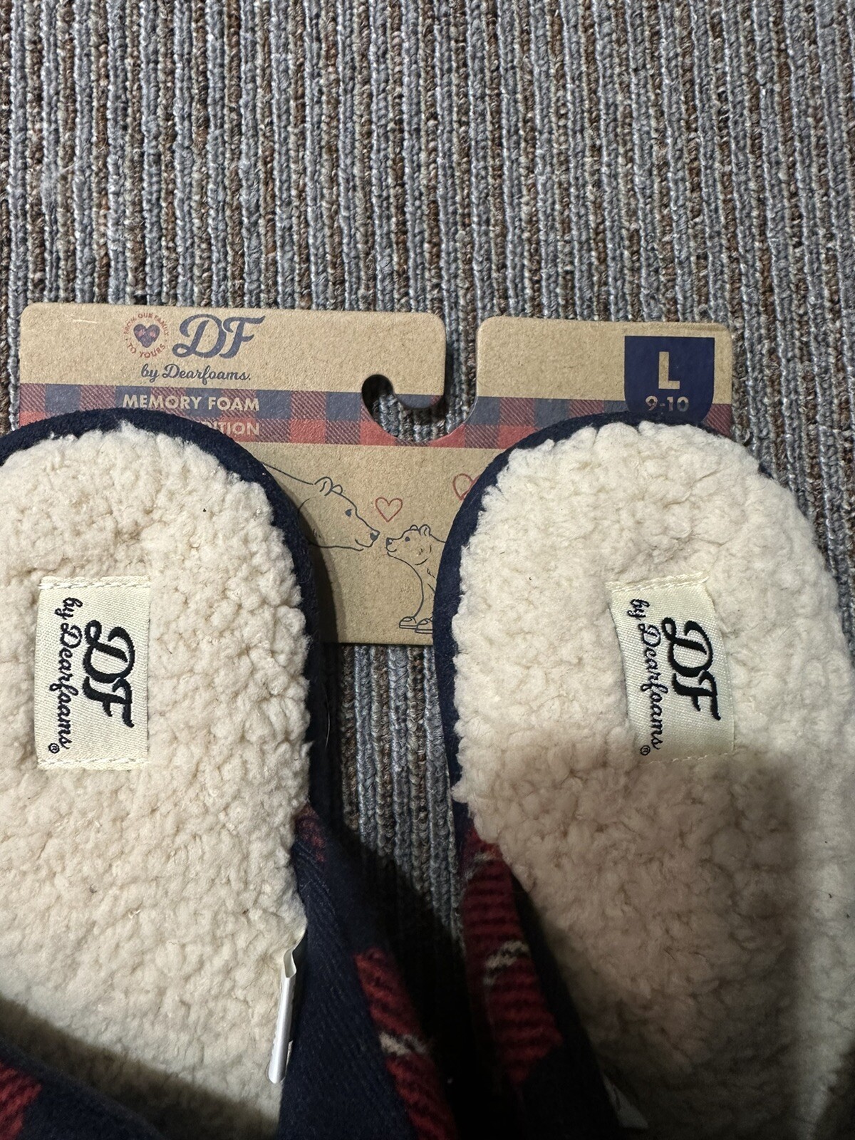 как выглядит Dearfoams Mama Bear Memory Foam Slippers Buffalo Plaid Fleece Lined Large 9-10 фото