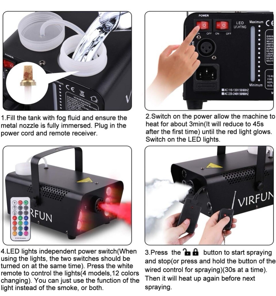 Fog Machine with 6 LED Controllable Lights, Wireless and Wired Remote Control