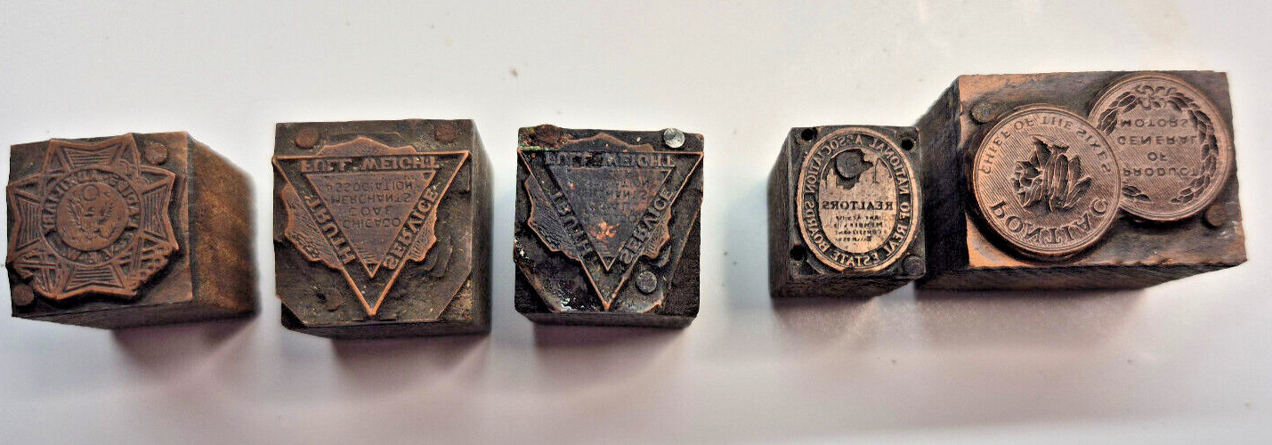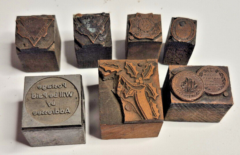 Vintage Letterpress Type Printing Block Metal Copper on Wood 12 Stamps