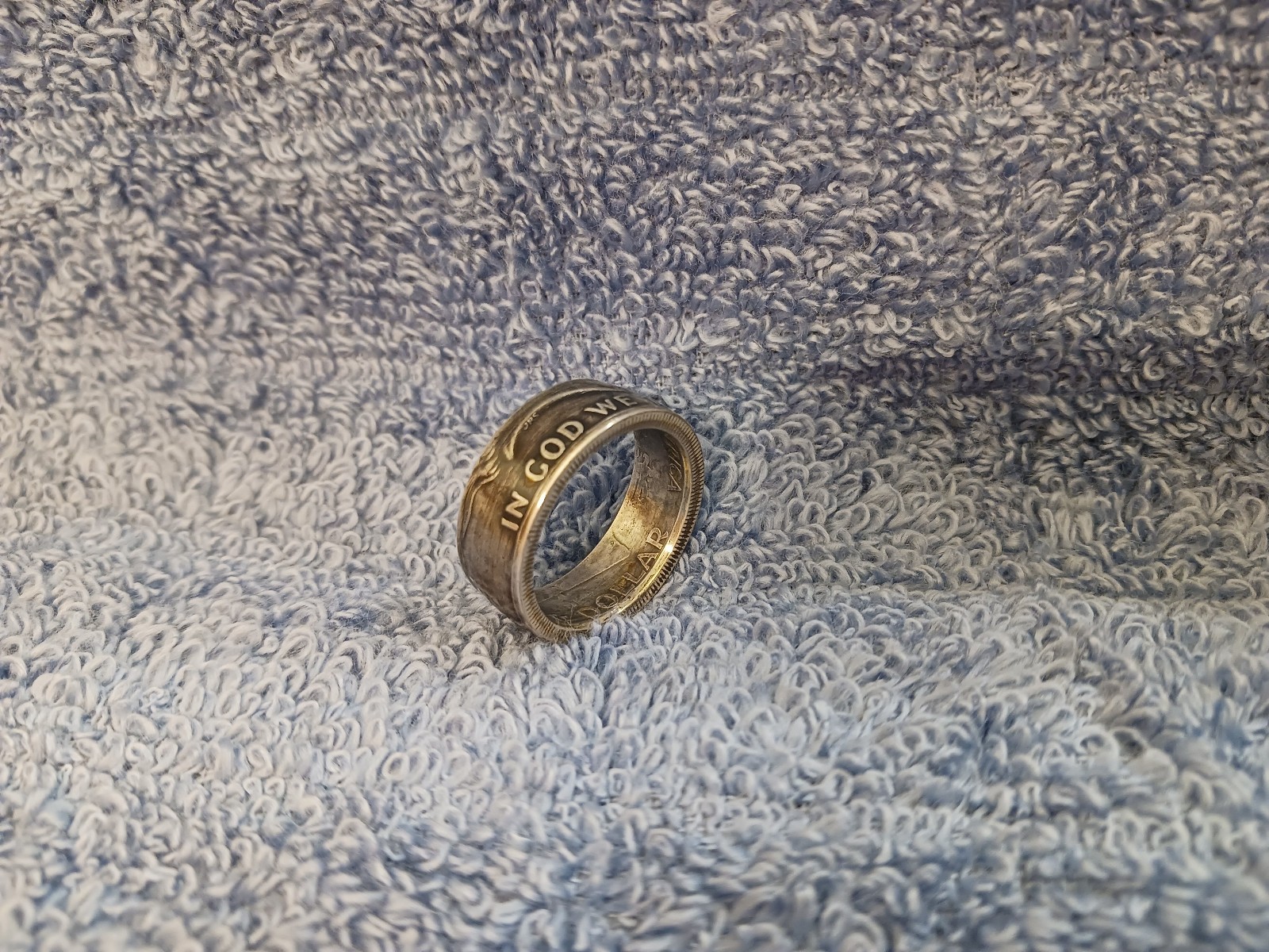 Handcrafted 1950 Franklin 90 silver half dollar coin ring size 11