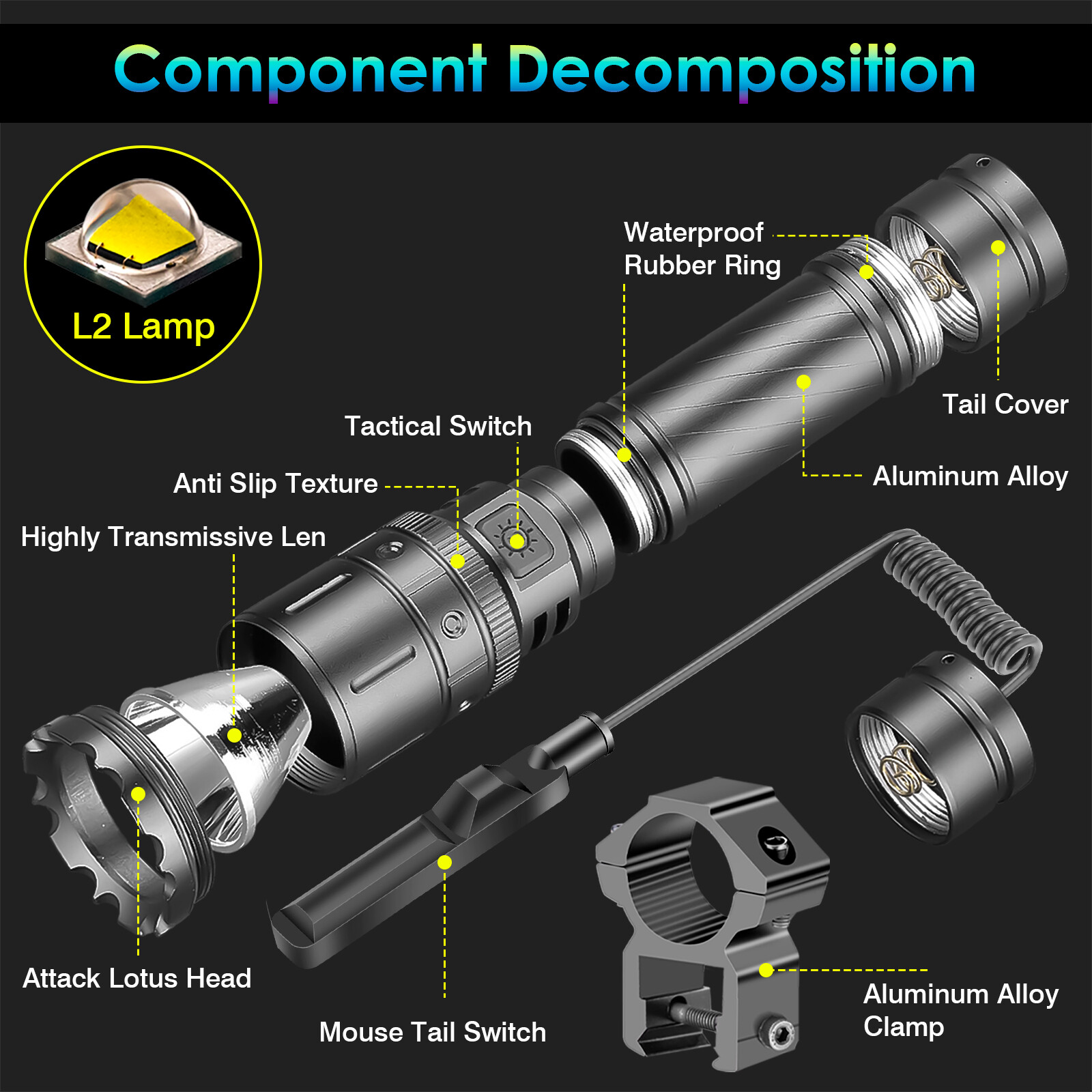 100000LM Gun Tactical LED Flashlight Picatinny Rail Mount for Hunting Shooting