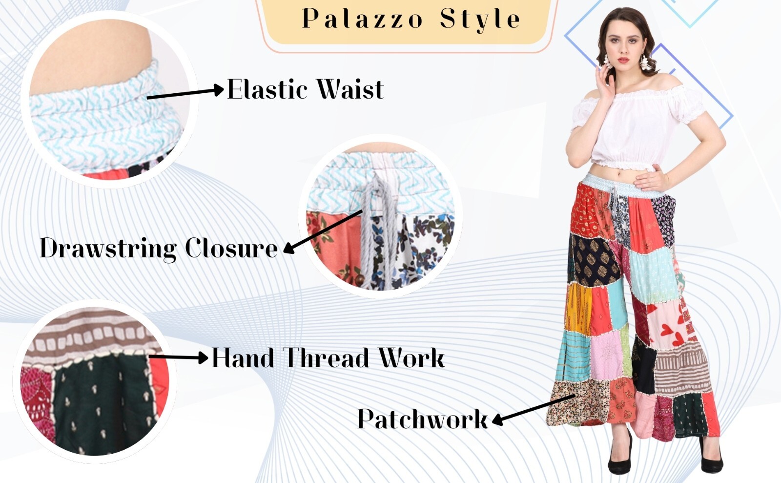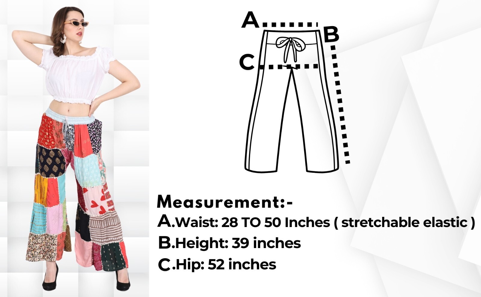 как выглядит Women Acidwash Multi Patchwork Long Palazzo Pant Elastic Waist Wholesale Mix Lot фото