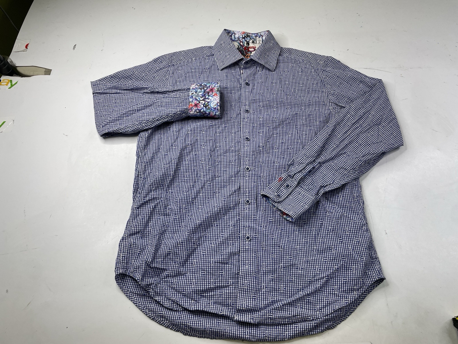 Robert Graham Blue White Checked Pattern Floral Flip Cuff Size Medium