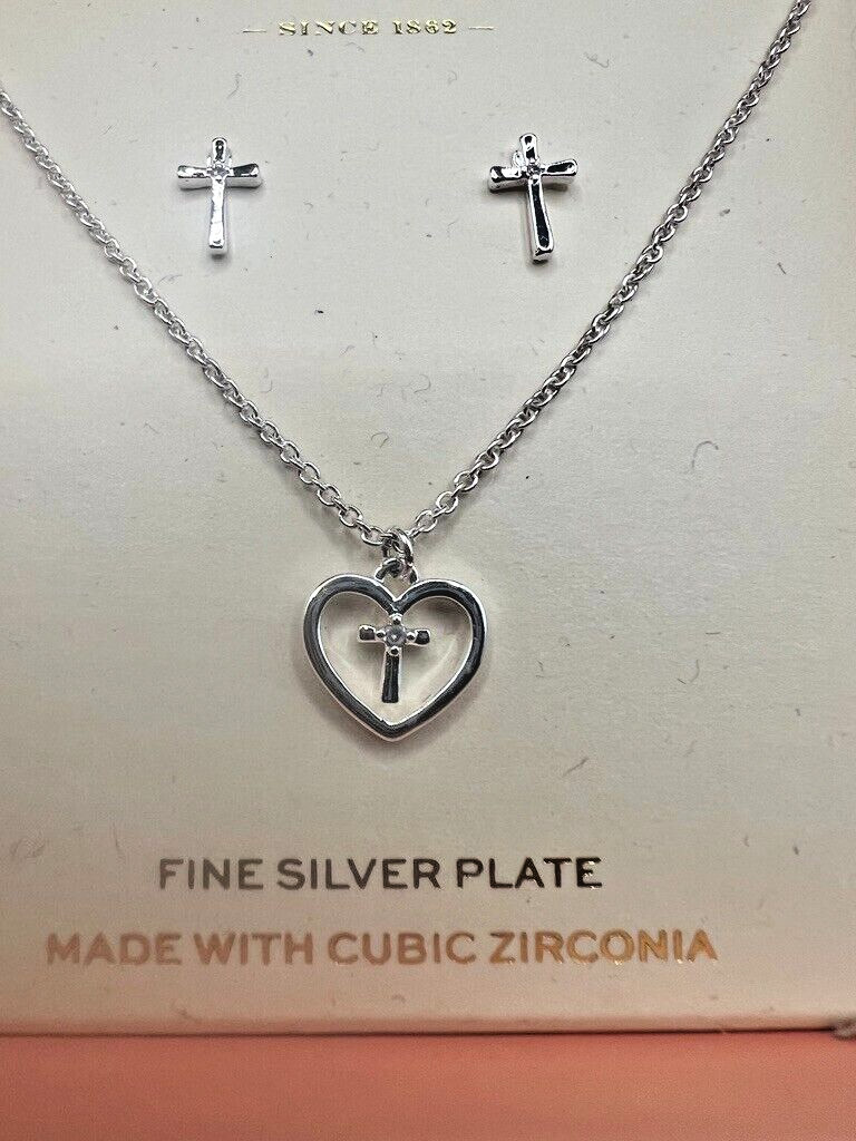 FAO Schwarz Childrens Cross Heart Necklace Earrings Set Fine Silver Plate Gift