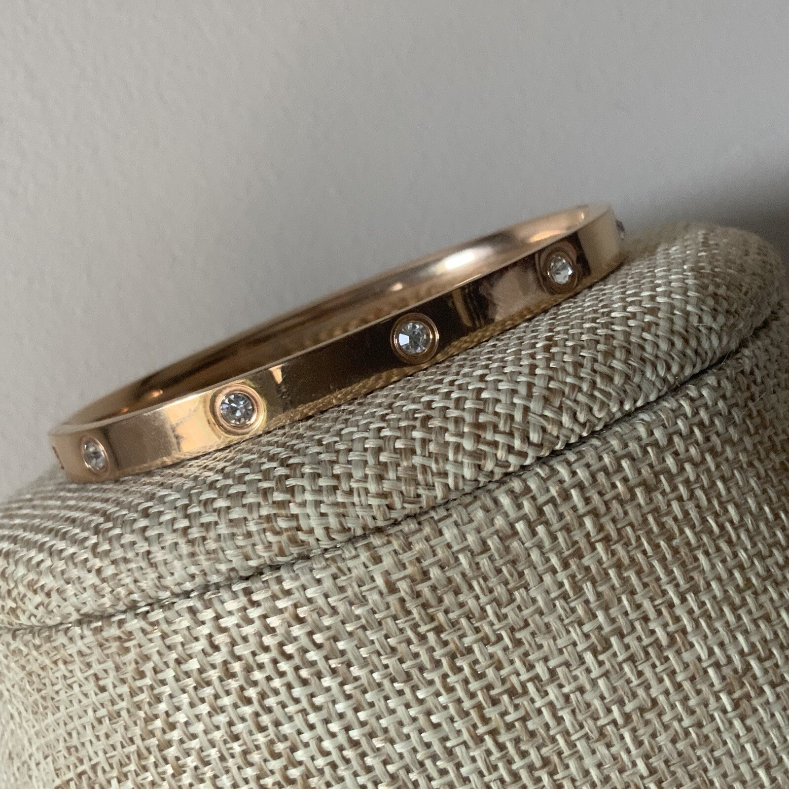 Rose gold colored Stainless steel rhinestone studded hinged bangle bracelet