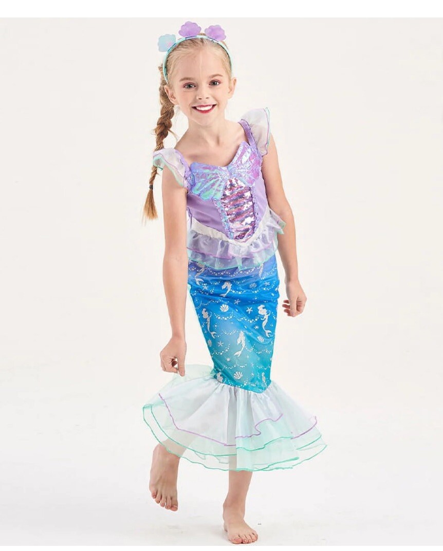 Girls Mermaid Costume Green Purple Dress Princess Toddler Child Headband 4-6Y