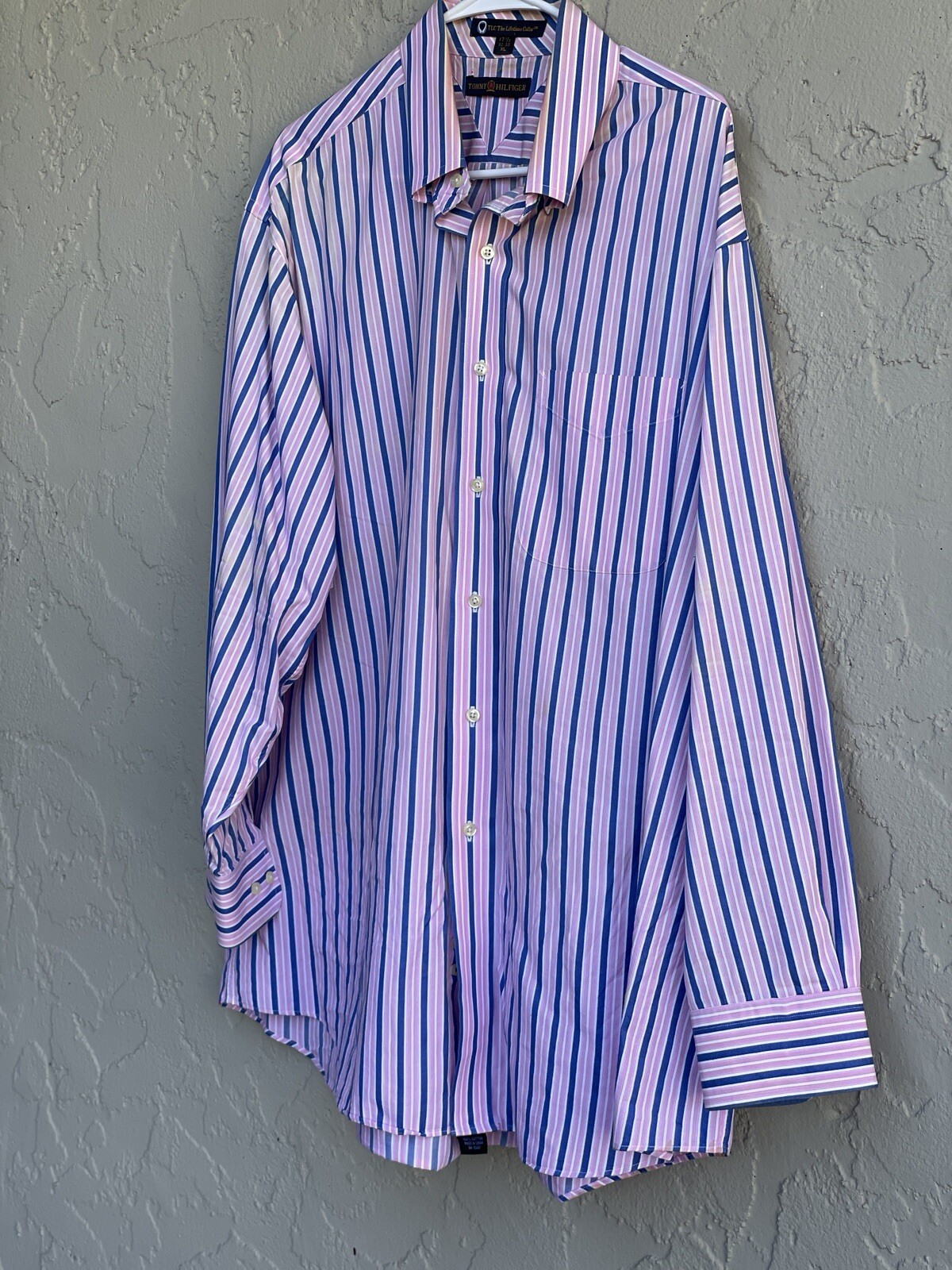 как выглядит Tommy Hilfiger Dress Shirt Lifetime Collar 17 1/2 32/33 XL Striped Stains фото