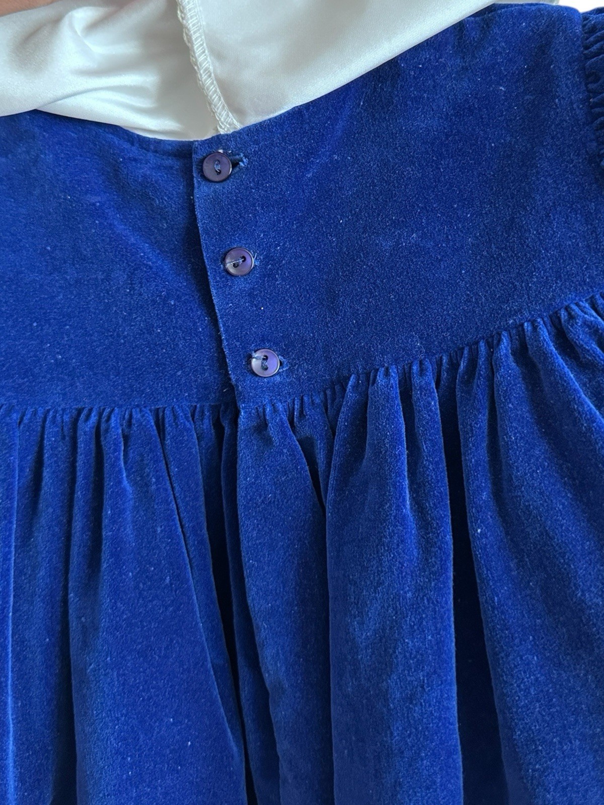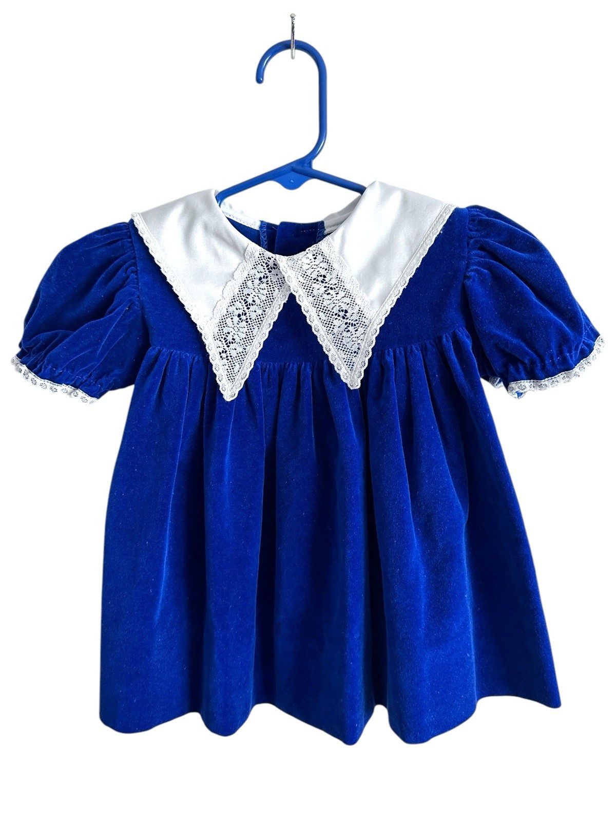 Rare Vintage Blue Velvet baby Girl size 12 months Dress Lace Trim collar/sleeves