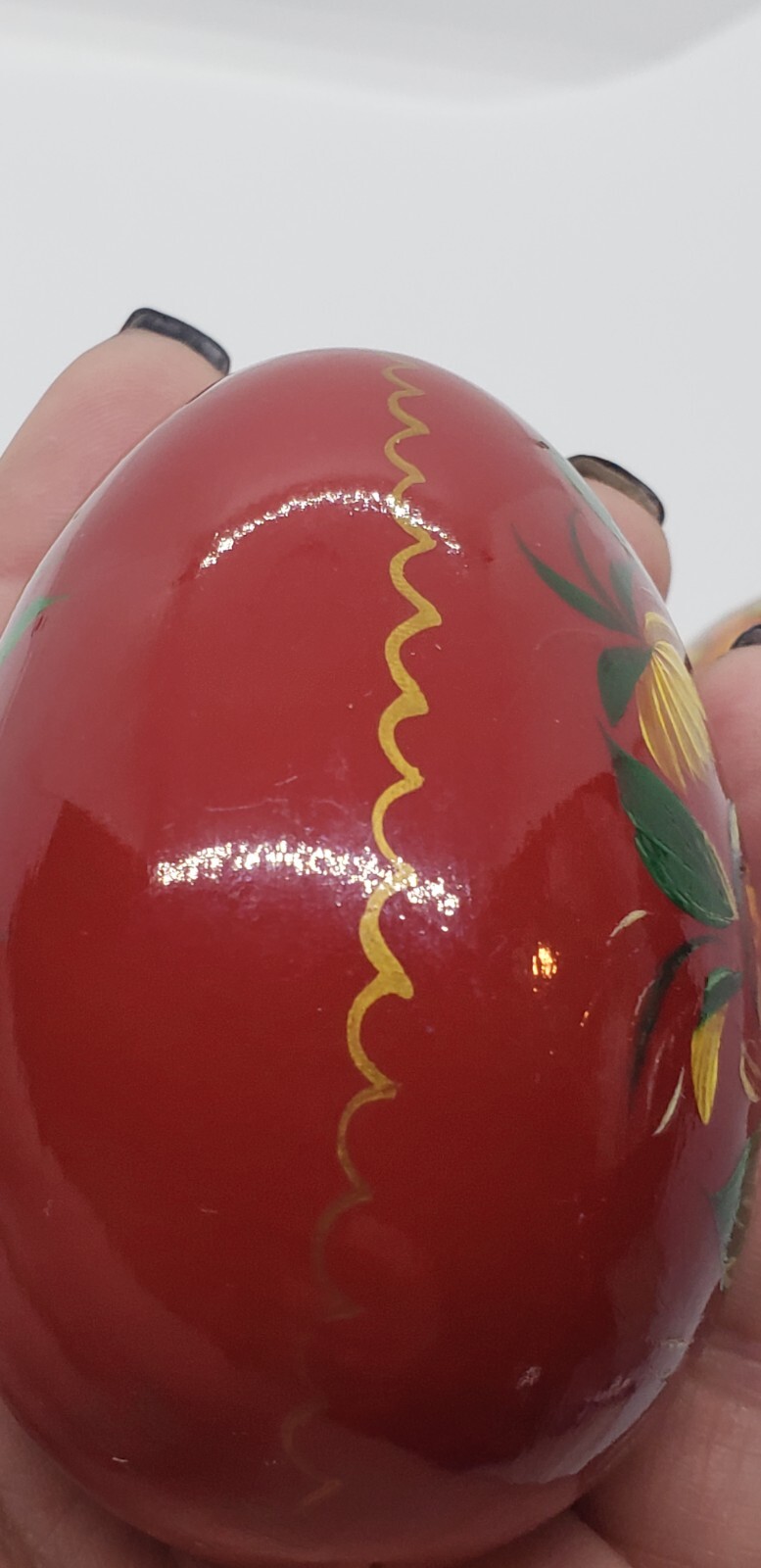 • Set 2 Extremely Fine Hand painted Red Russian Wooden Egg Signed Floral Lacquer