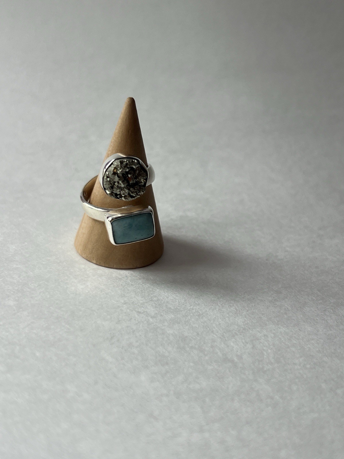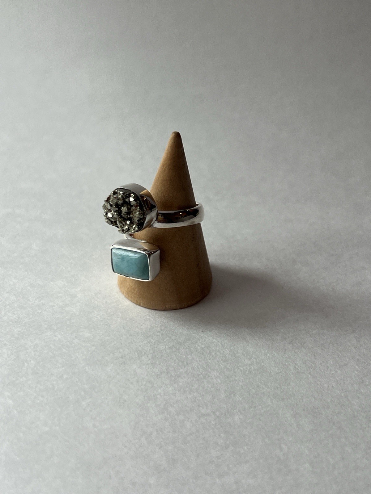 Larimar Pyrite Ring 925 Sterling Silver, Adjustable Size 7