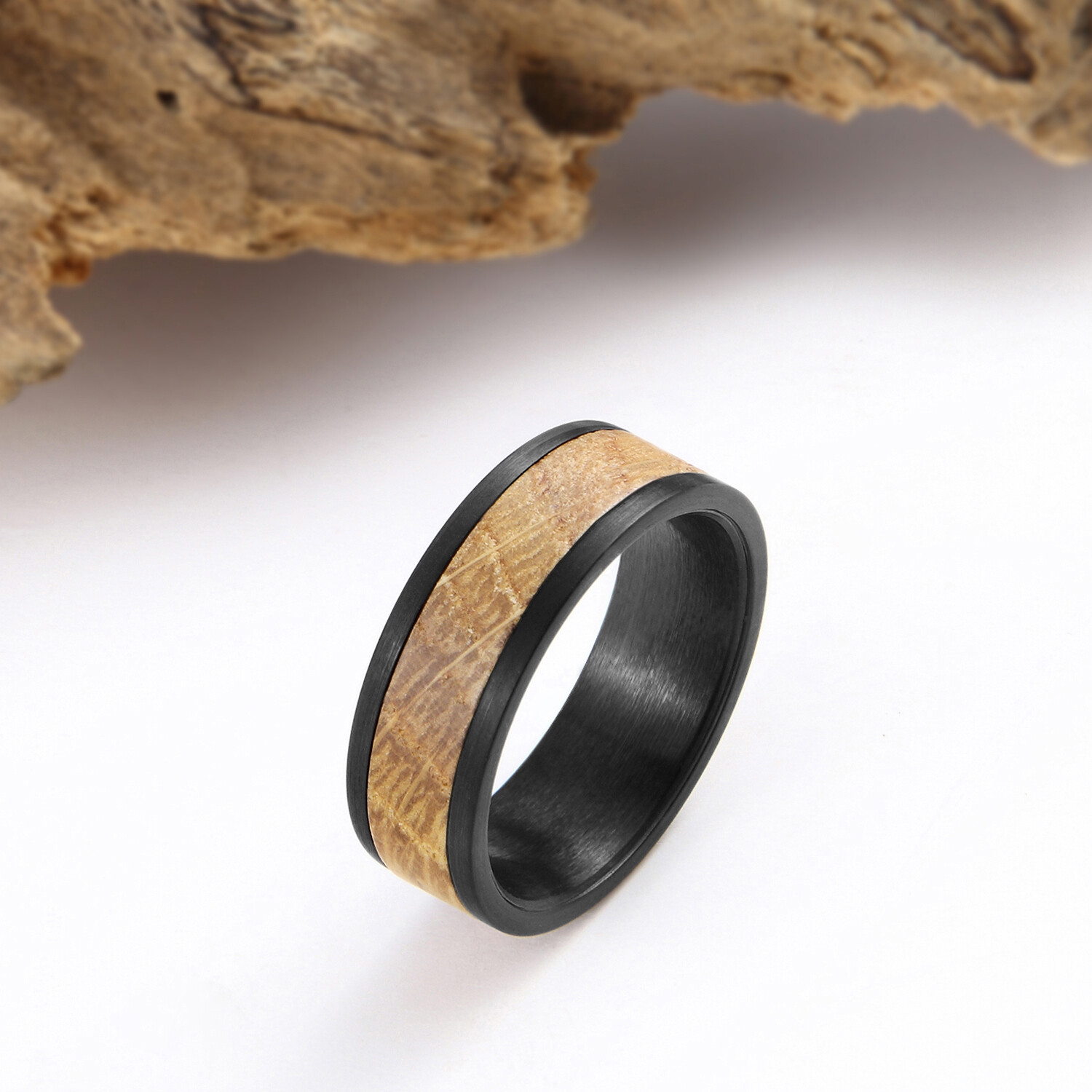 Handmade 8mm Black Brushed Metal Men's Whiskey Barrel Wood Wedding Band Ring