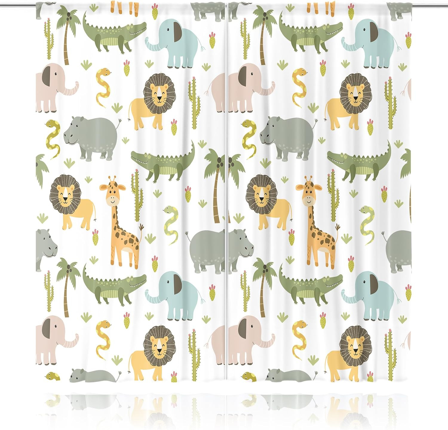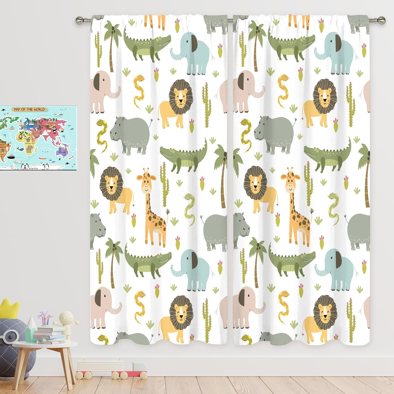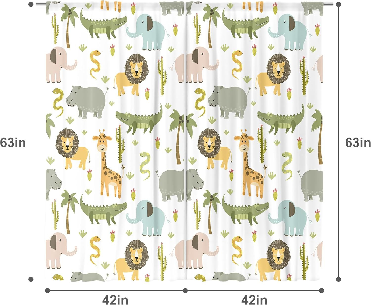 Kids Safari Curtains 42W X 63H Inch Rod Pocket Cute Cartoon Animals Baby Boy Nur