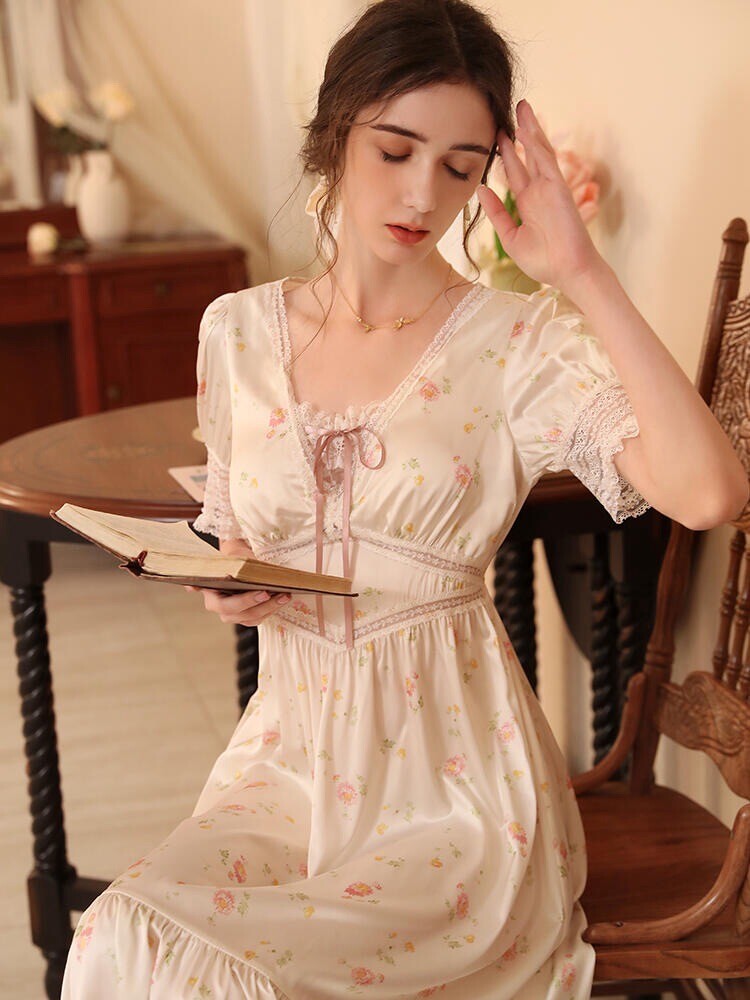Vintage Elegant Floral Nightgown Long Soft Sleep Dress French Cottagecore Lace