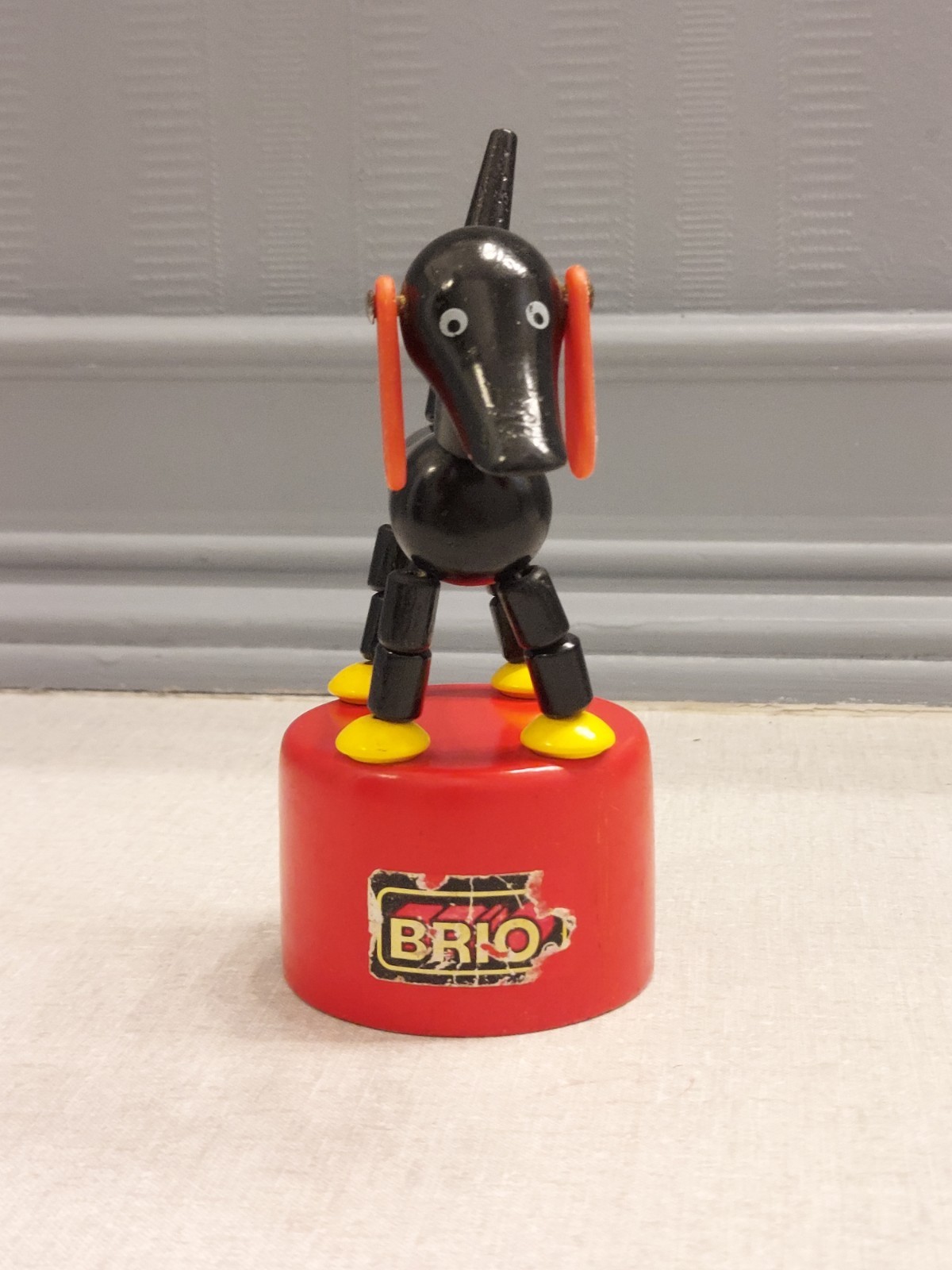 Vintage Brio Dachshund Sampo Made in Sweden Wooden Black Dog Push Up Puppet Toy