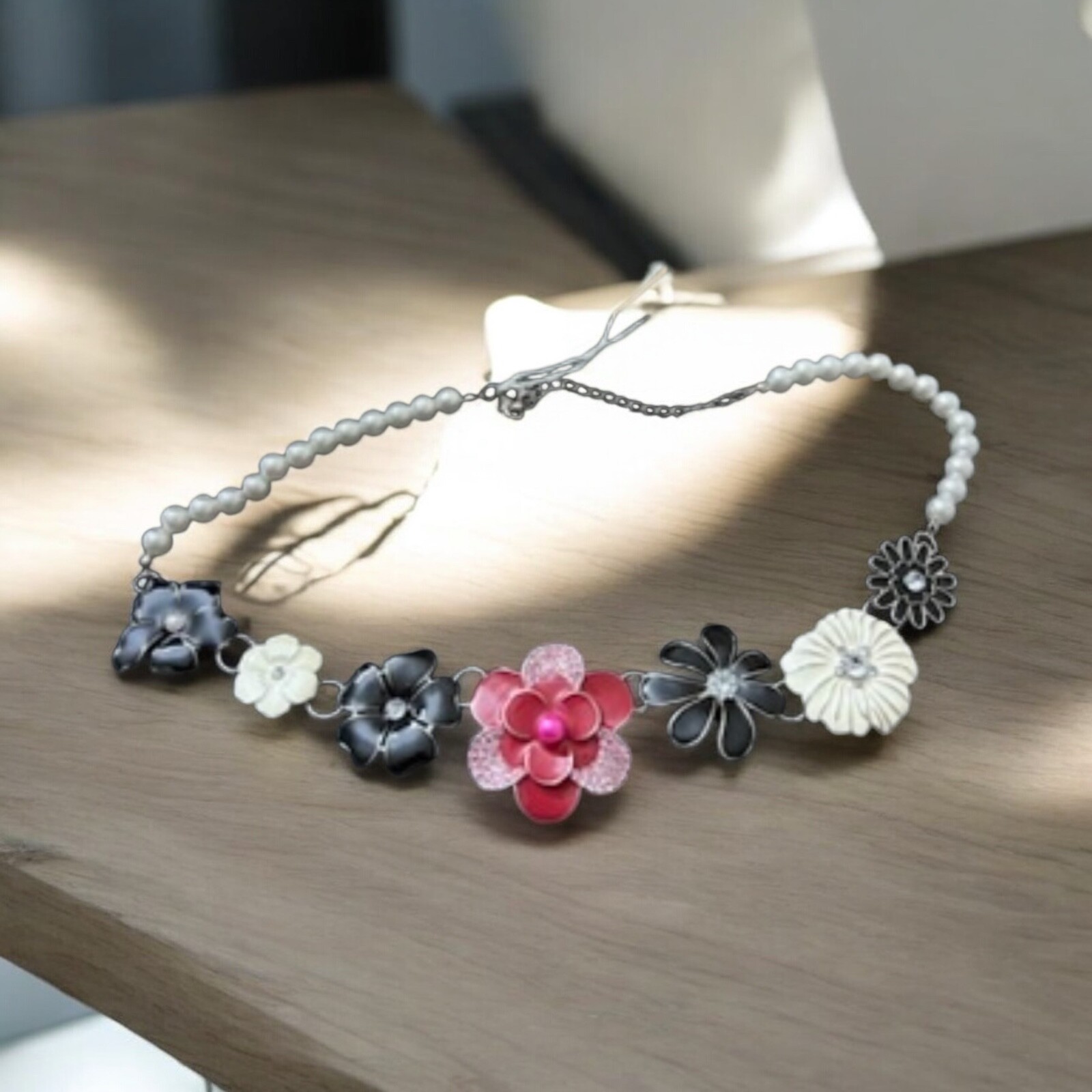 Vintage Faux Pearl And Colored Enamel Flower Statement Necklace 20