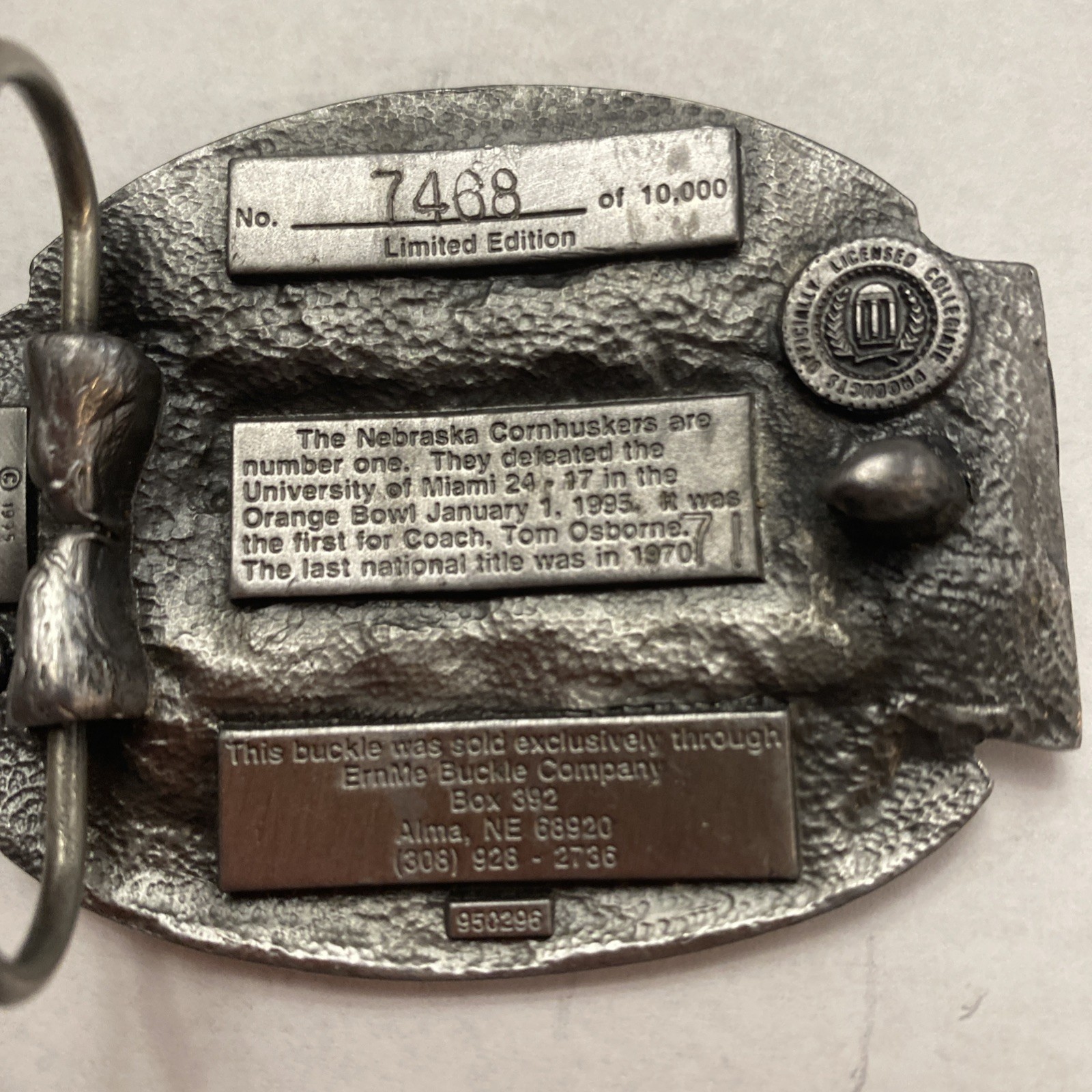 • Nebraska va Miami, 1994 National Championship Belt Buckle. Football. NOS.