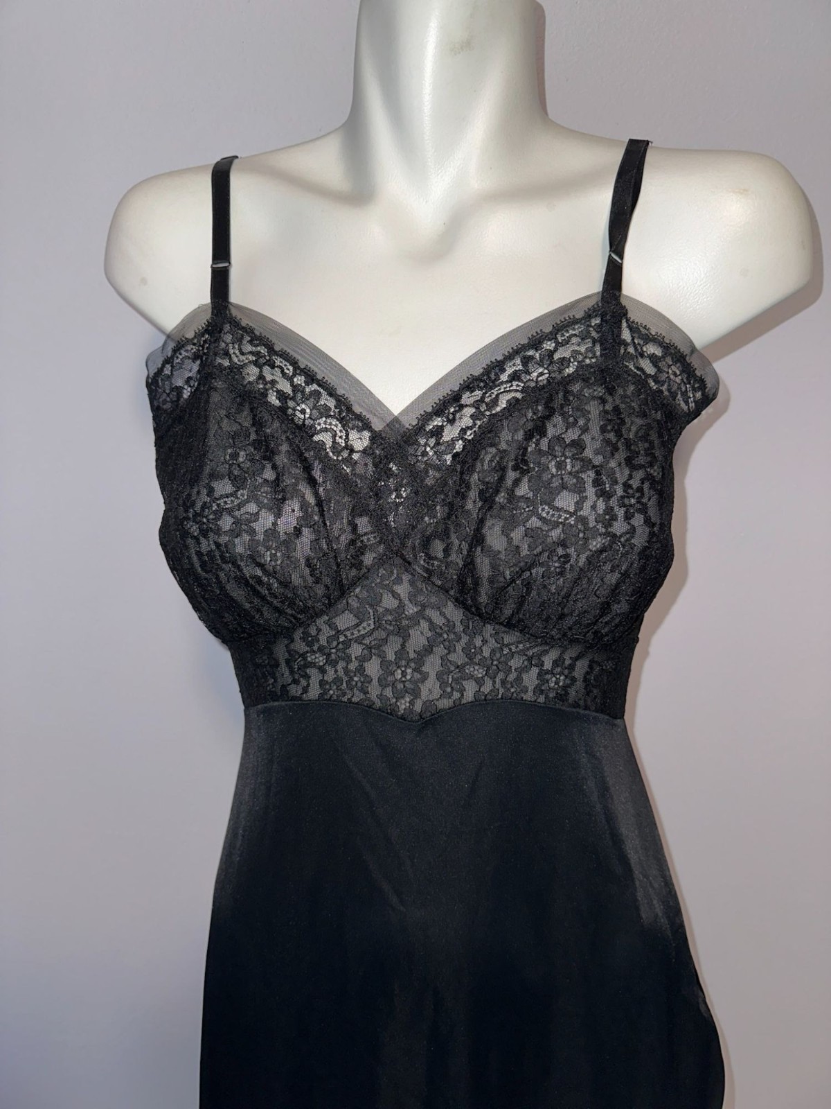 как выглядит Vtg 1950s Slip Van Raalte Black Opaquelon Lace Trim Nylon Nightgown Size 32 фото