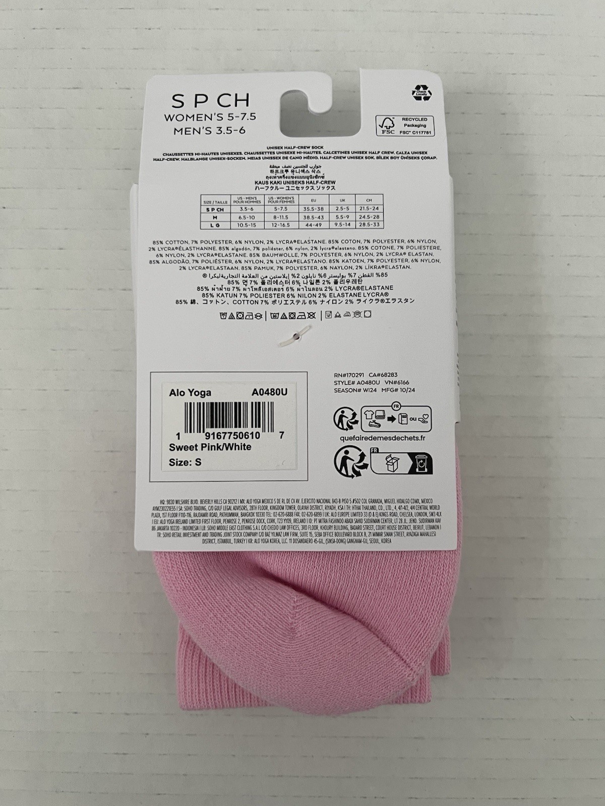 Alo Unisex Half-Crew Sock Sweet Pink/White Size Small