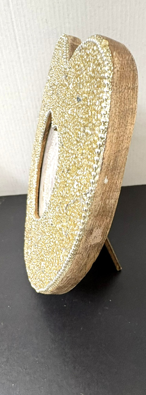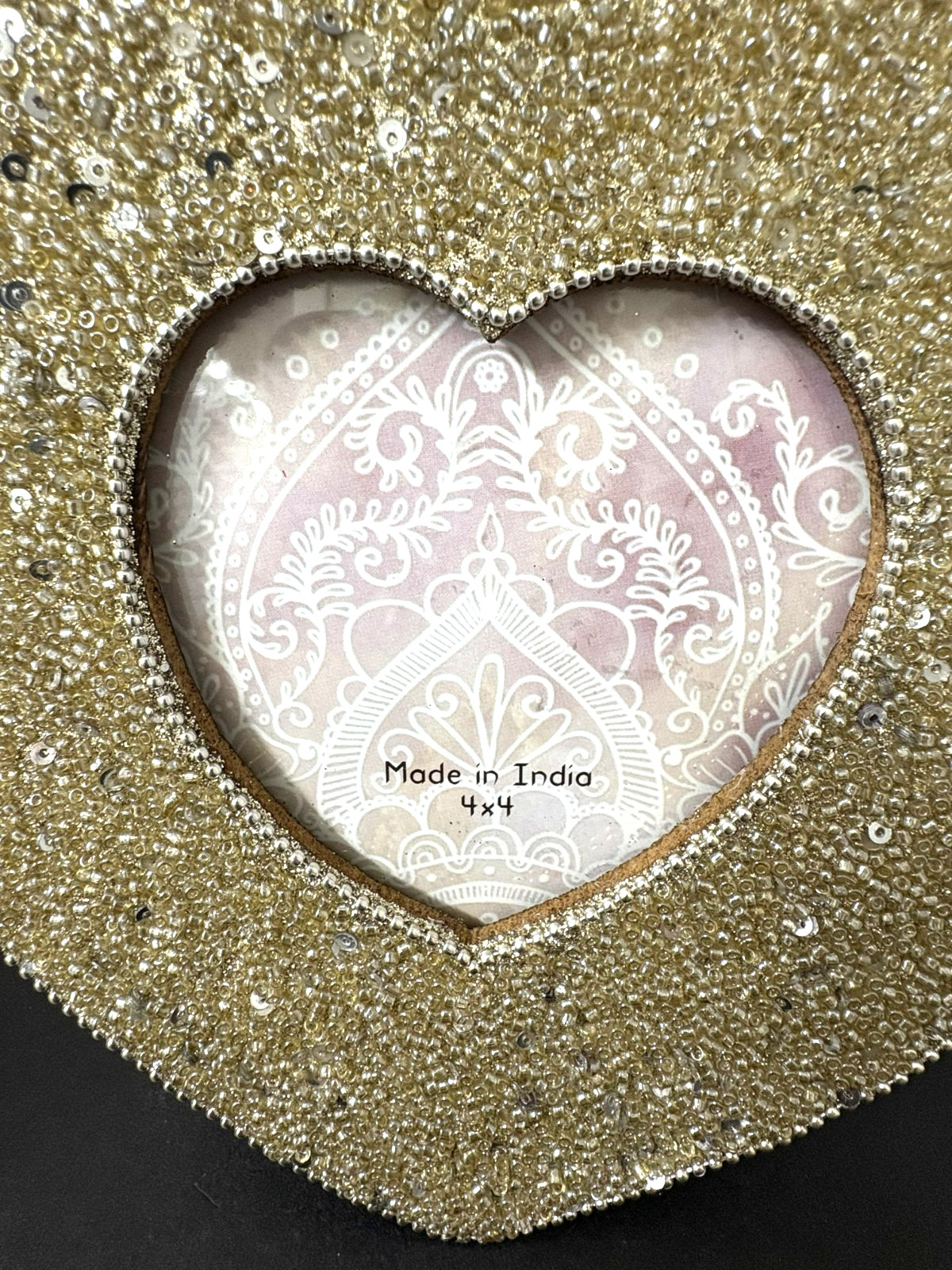 Handcrafted in India Beaded Heart Photo Picture Frame Gold Ivory Beads 4 x 4 in