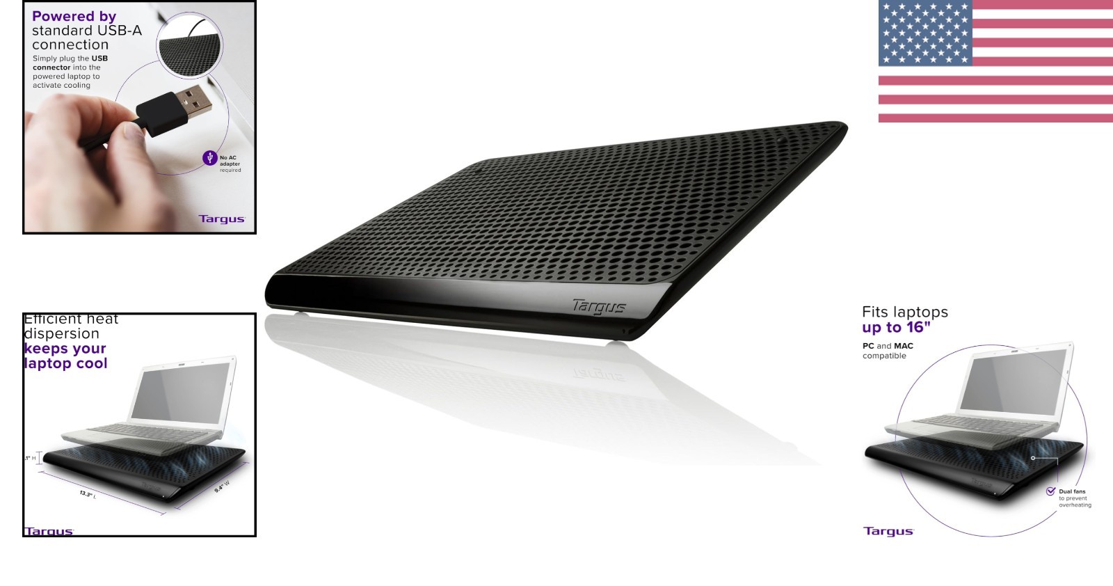 Особенности: USB-Powered, POWERFUL LAPTOP COOLING FANS, Adjustable work surface, Rubber grips for stability, Portable and lightweight, Easy USB-A connection, Dual fan cooling system