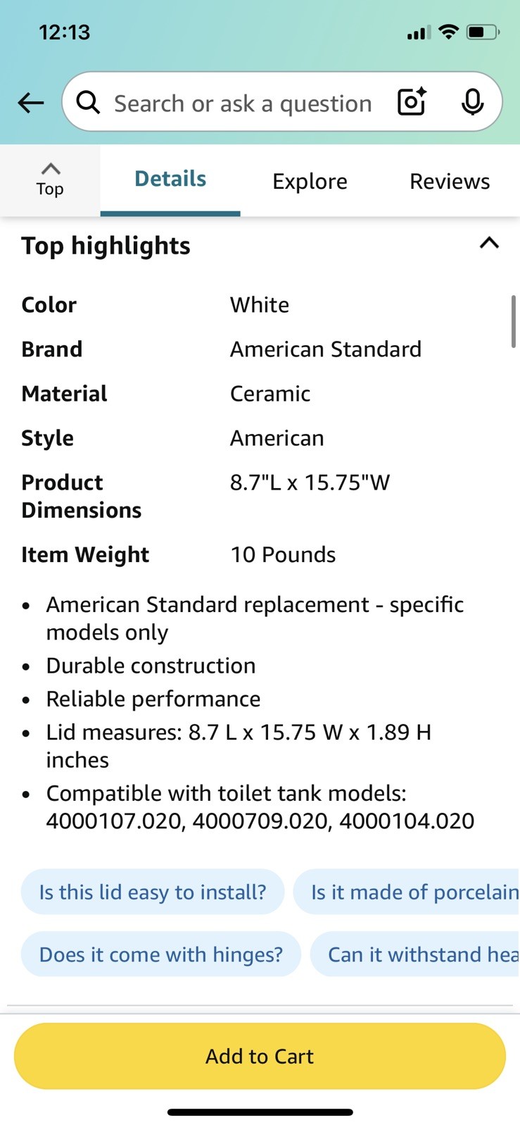 как выглядит American Standard 735158-400.020 Studio Replacement Toilet Tank Lid White фото