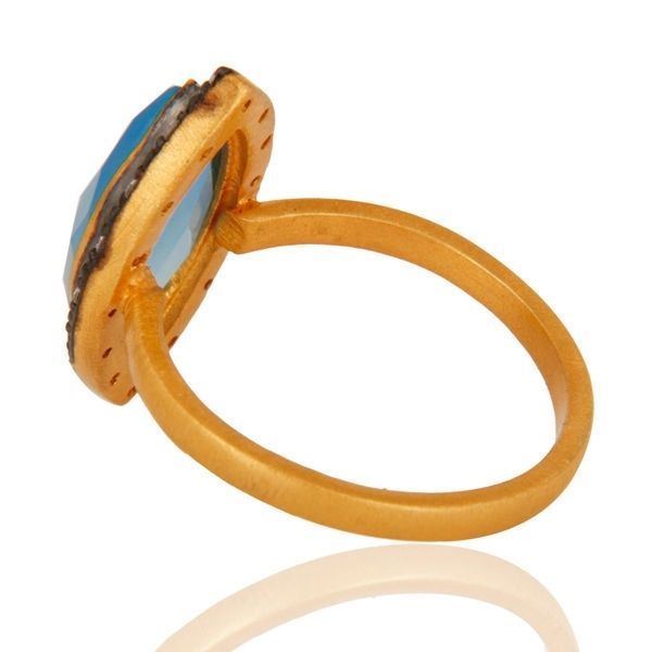 Natural Blue Chalcedony Gemstone CZ Ring Gold Plated 925 Sterling Silver Jewelry