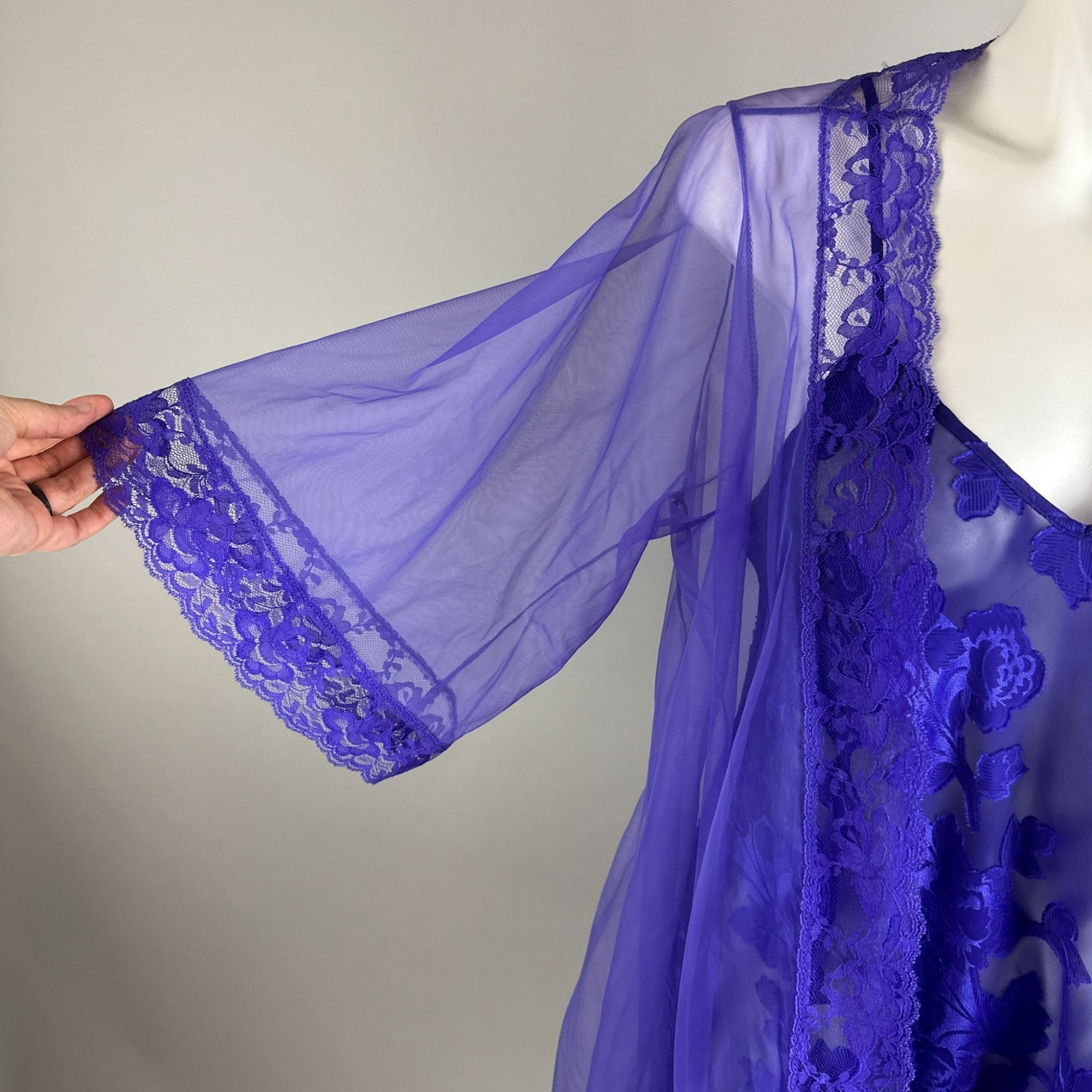 как выглядит Vtg 90s Purple Nightgown Peignoir Robe Set Medium Nylon Floral Lace Boudoir фото
