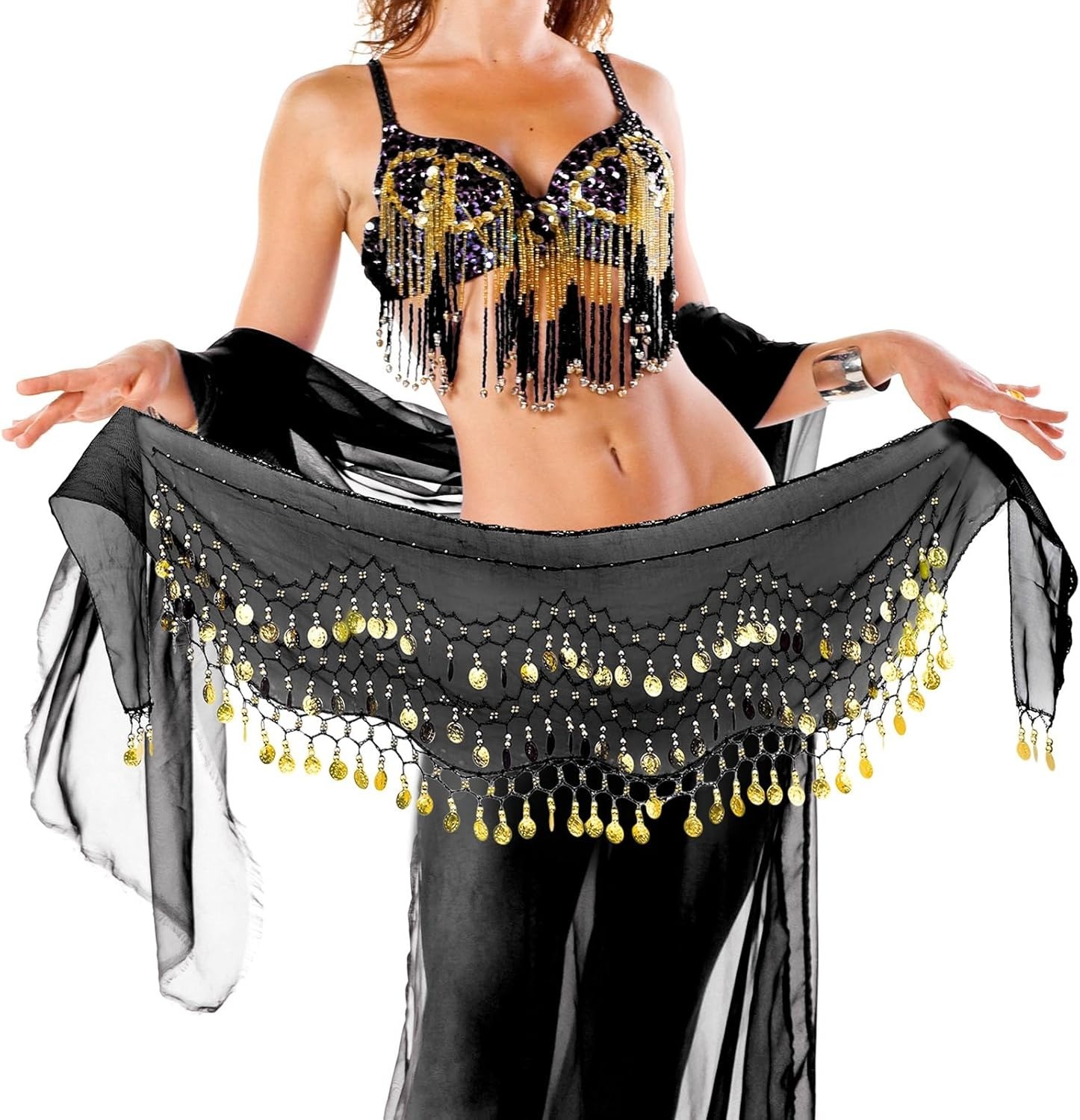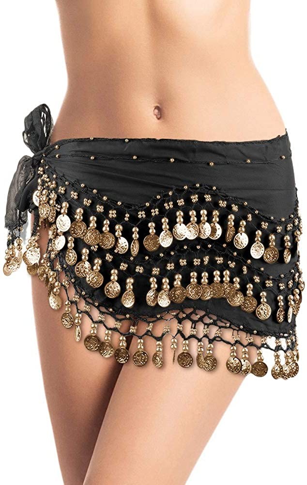 3 Rows Gold Coins Belt Belly Dance Costume Black Hip Scarf Dancing Skirt Wrap