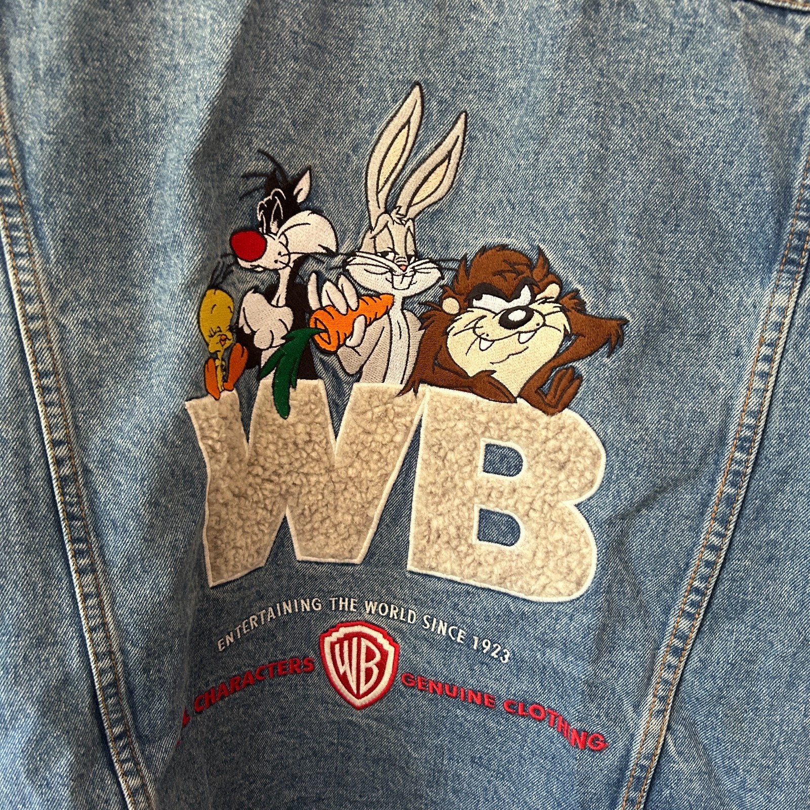 Warner Bros Looney Tunes Denim Jacket Womens Large Sherpa Collar Embroidered VTG