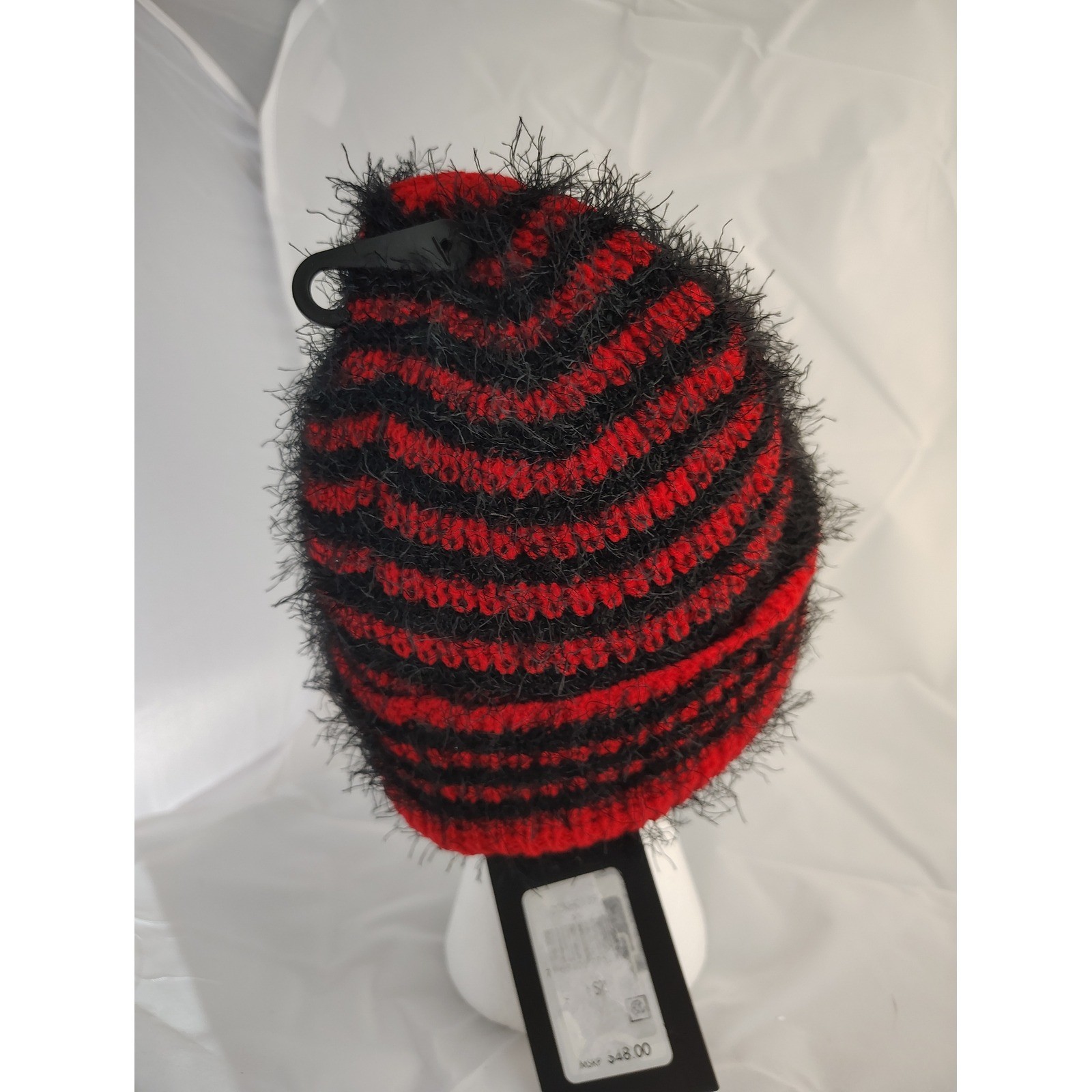 как выглядит DKNY Red Black Striped Fuzzy Knit Beanie Hat Winter Warm Stylish фото
