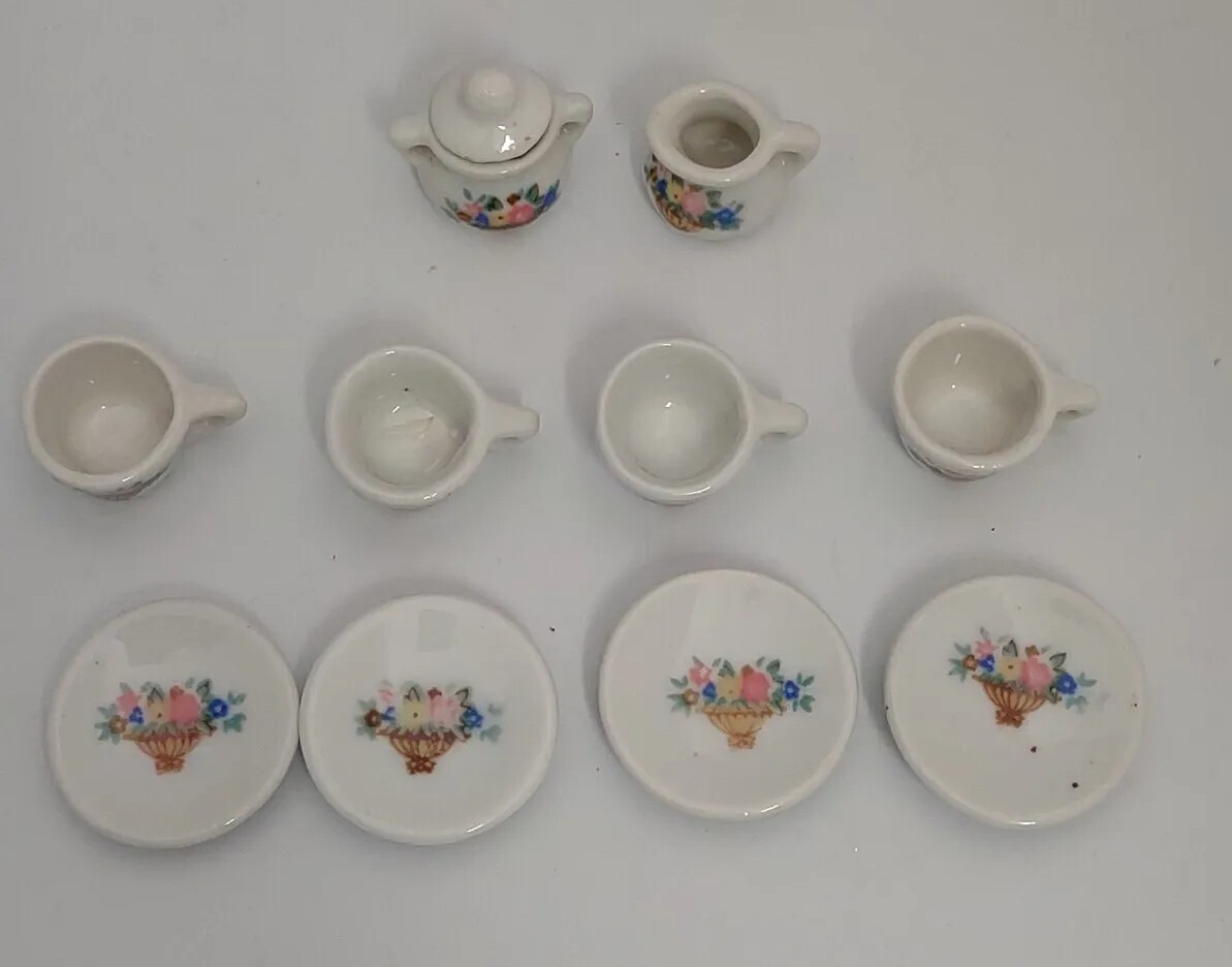 Vintage Child's Tea Set Play Dishes 4 Tea Cups Saucer Set Floral Flower Basket