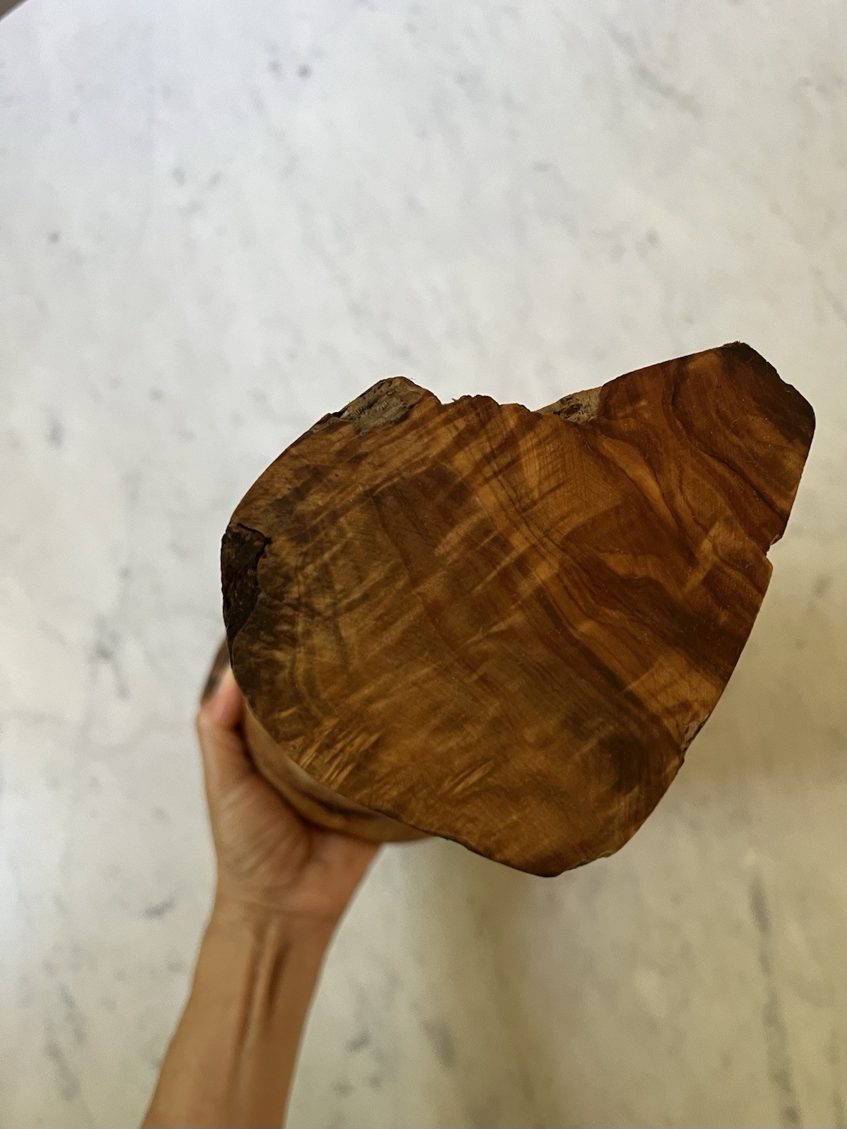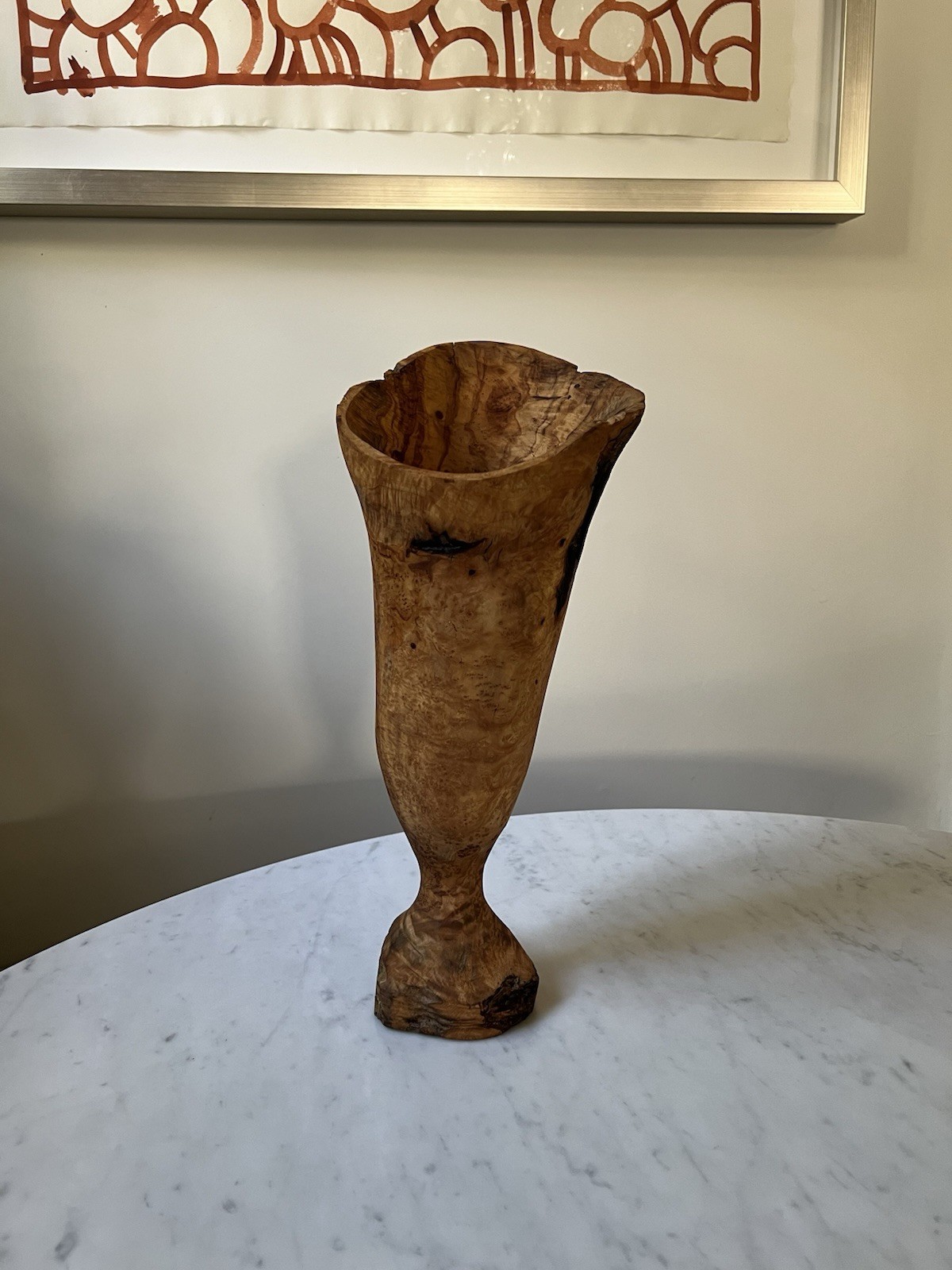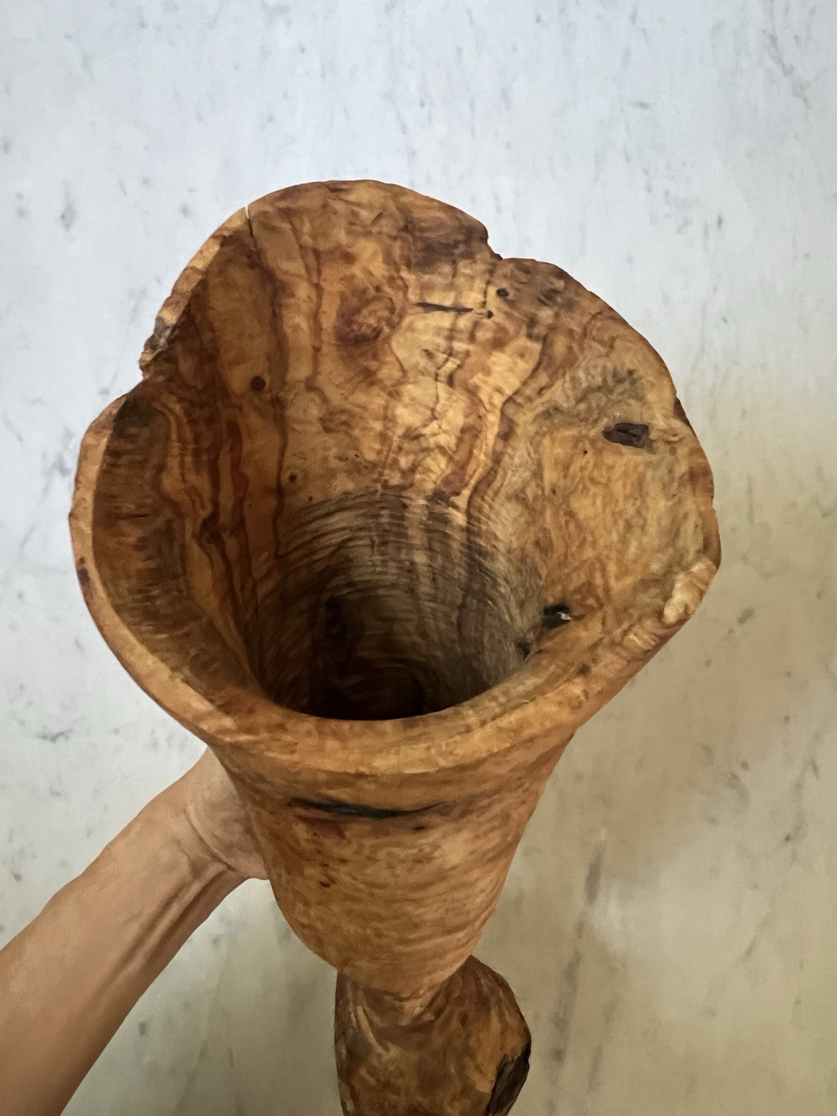 RUSTIC MODERN ORGANIC FORM HAND-CARVED WOODEN FOOTED VASE SCULPTURE OLIVE WOOD