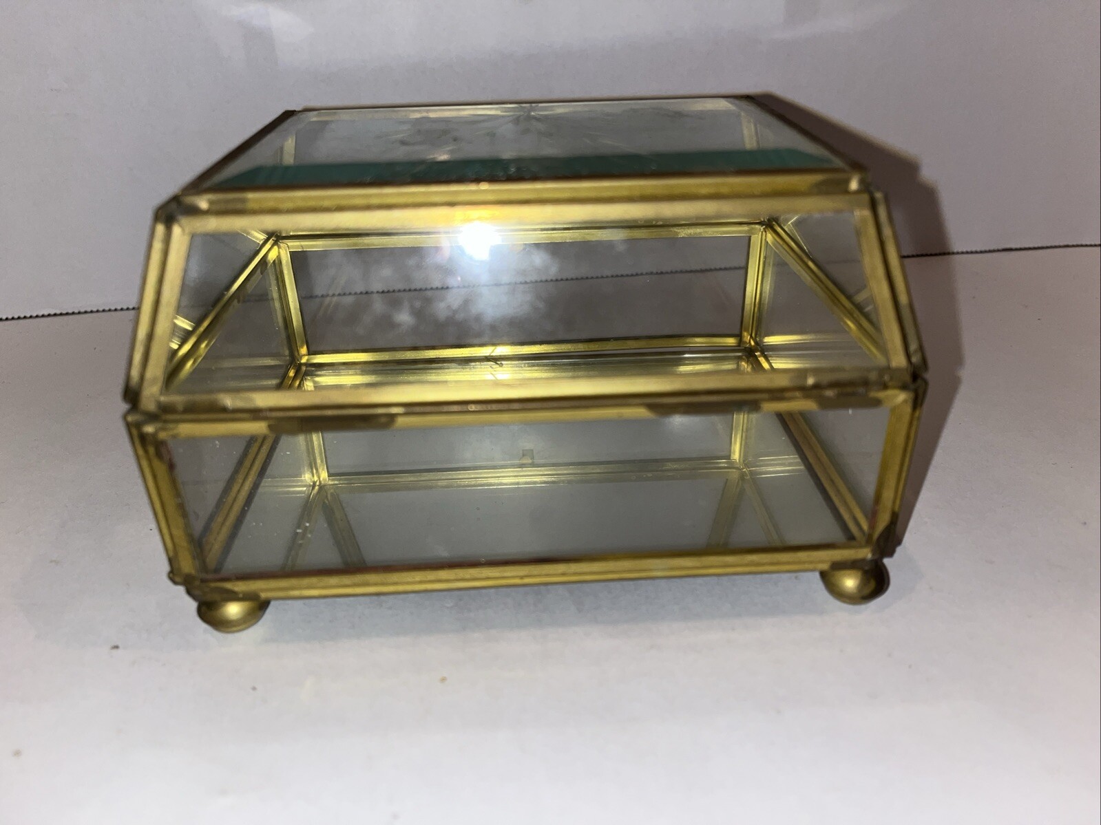 как выглядит Small Trinket Display Box Footed Brass Beveled Glass Etched Lid Mirror Bottom фото