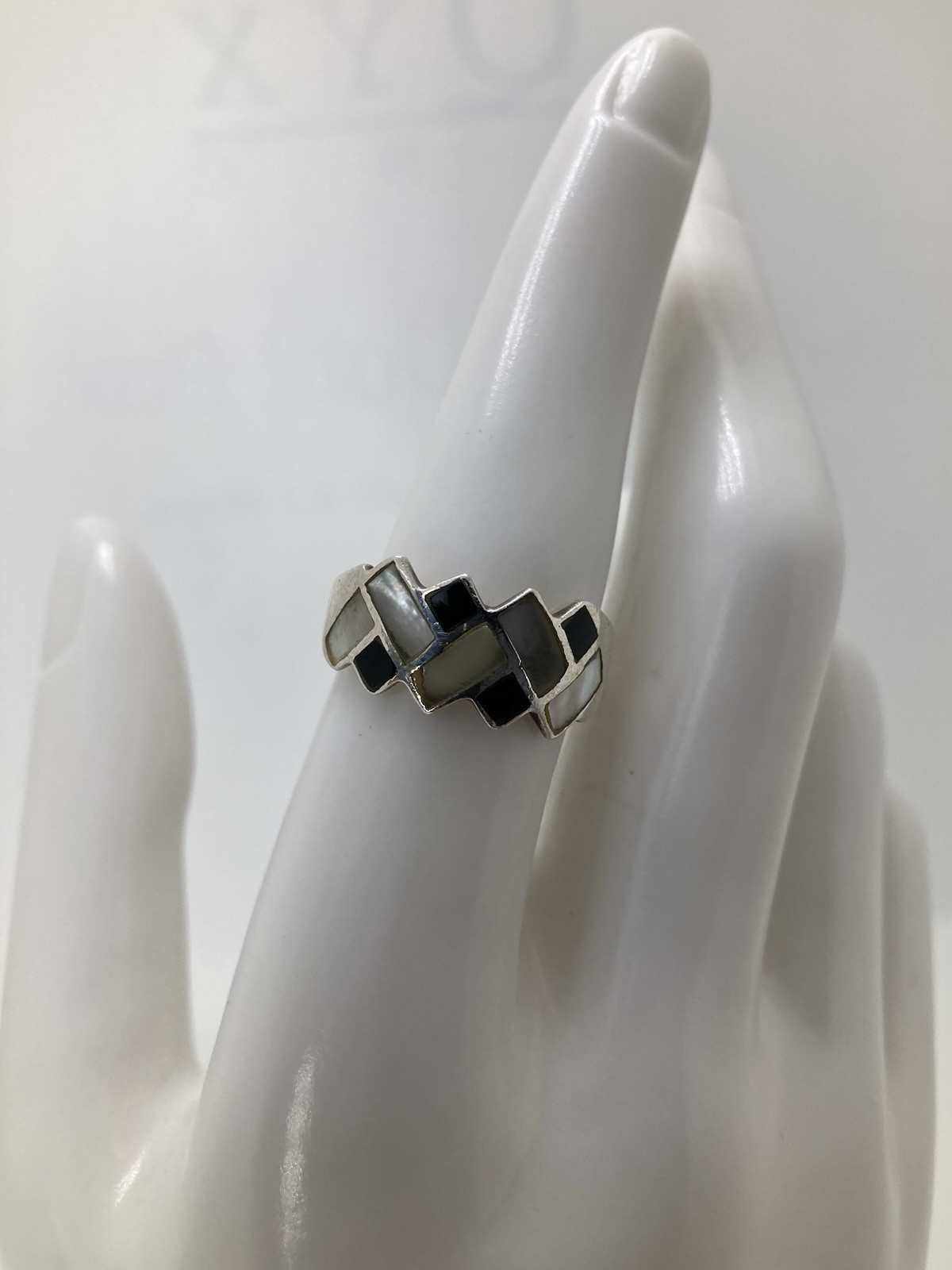 Sterling Silver Mother Of Pearl Onyx Inlay Old Vintage Band Ring Size 7.5