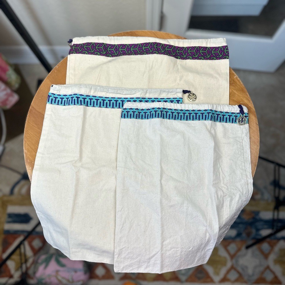 Tory Burch Set Of 3 White Canvas Bags with Purple and Blue Accents drawstring
