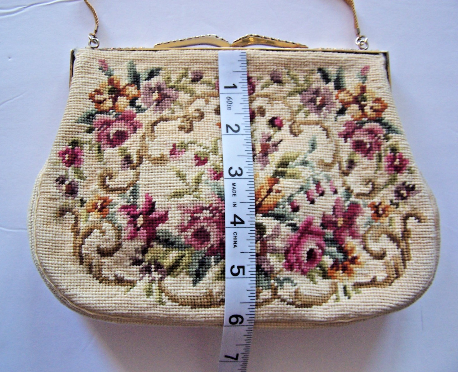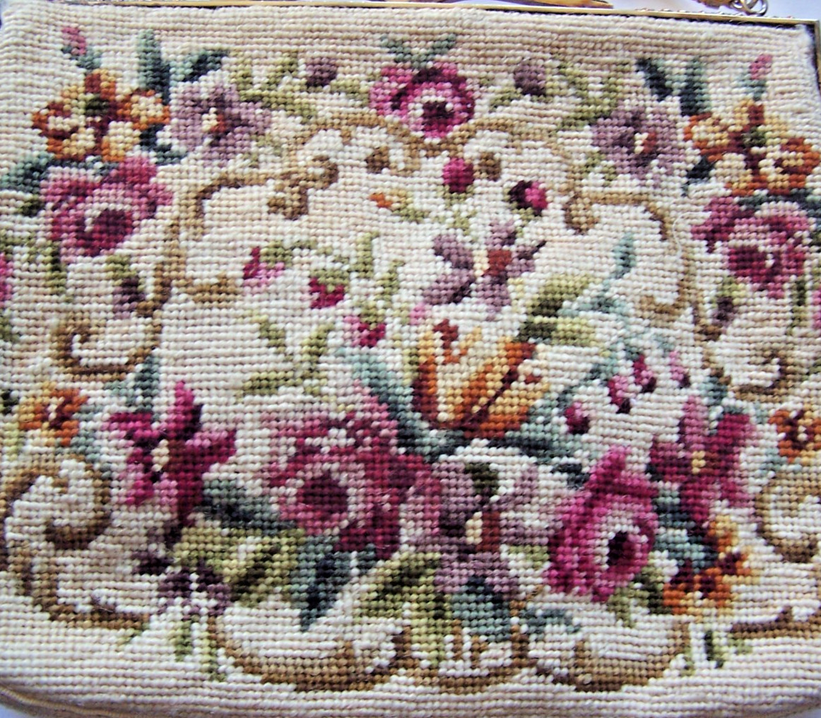 Vtg PURSE Tapestry Petit Point Needlepoint Floral Framed Ornate Metal Kiss Lock